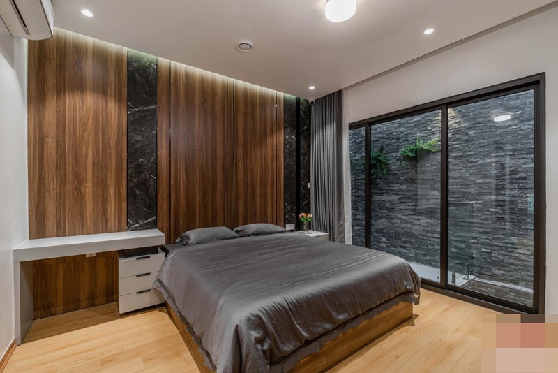 Phòng ngủ bố mẹ đơn giản với gam màu trầm, nội thất bố trí ít để người sử dụng có nơi nghỉ ngơi thông thoáng.