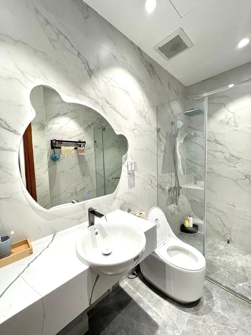 Phòng vệ sinh dùng bồn đá trắng tinh tế. Phòng vệ sinh phòng em bé sử dụng nội thất nhỏ xinh, phù hợp với độ tuổi, chiều cao của trẻ nhỏ.