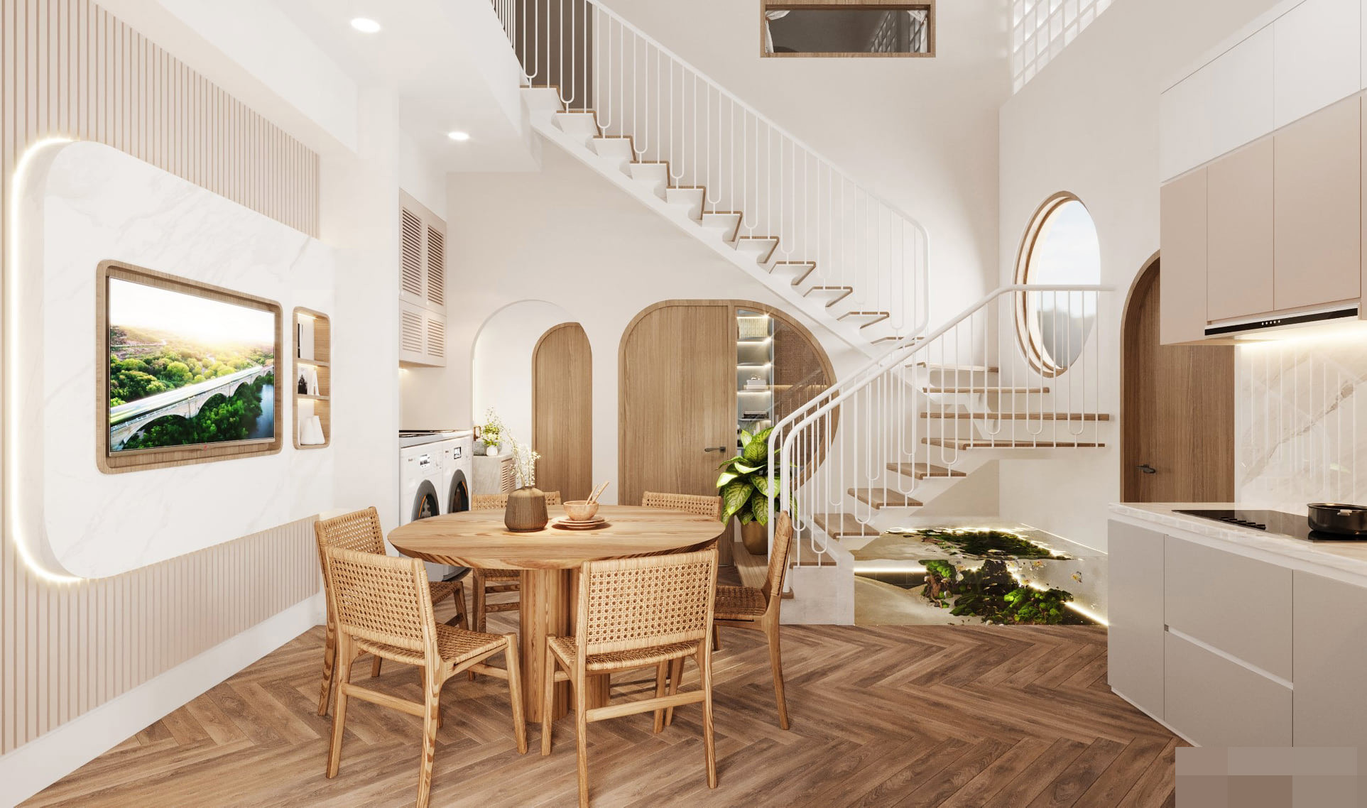 Phòng bếp và bàn ăn có sự giao lưu với thiên nhiên bên ngoài qua cửa sổ, cửa hậu. Phần sàn lát gạch xương cá sang trọng, tinh tế. Tủ bếp làm đơn giản, hệ cánh phẳng dễ vệ sinh, lau dọn. Những khung cửa bo cong làm không gian hài hòa, phá vỡ sự khô cứng của hình khối vuông vức.