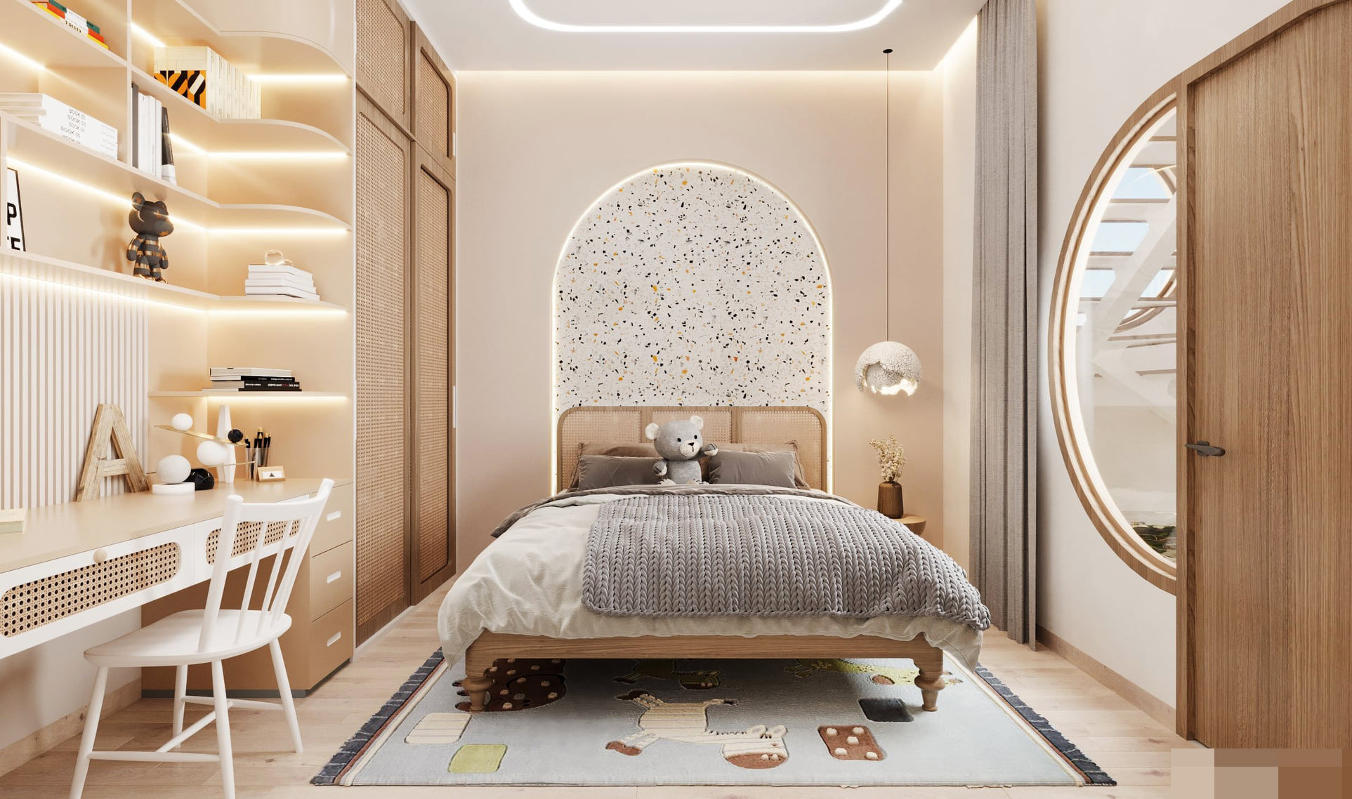 Phòng ngủ tầng 1 ấm cúng, thanh lịch nằm cạnh cầu thang dẫn lên tầng 2. Khung cửa sổ hình bán nguyệt nối với bếp giúp phòng có nhiều ánh sáng.