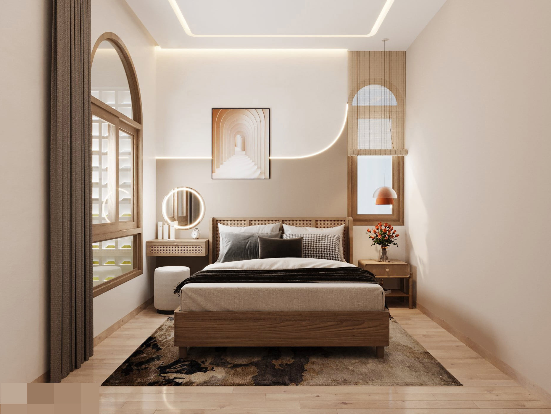 Phòng ngủ master tầng 2 thiết kế hiện đại dành cho bố mẹ. Phòng lấy không khí tươi từ cửa sổ kết nối giếng trời.
