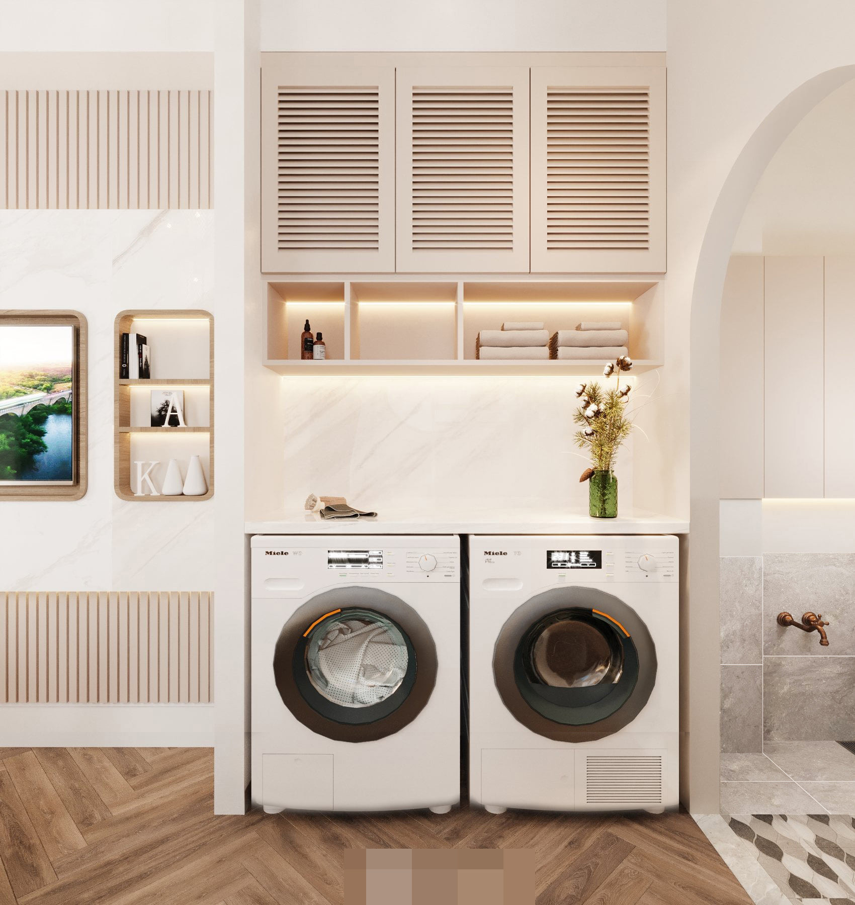 Khu giặt sấy và bồn rửa mặt ở tầng 1. Công năng liên hoàn, tiện nghi giúp việc dọn dẹp, giặt đồ được thuận tiện.