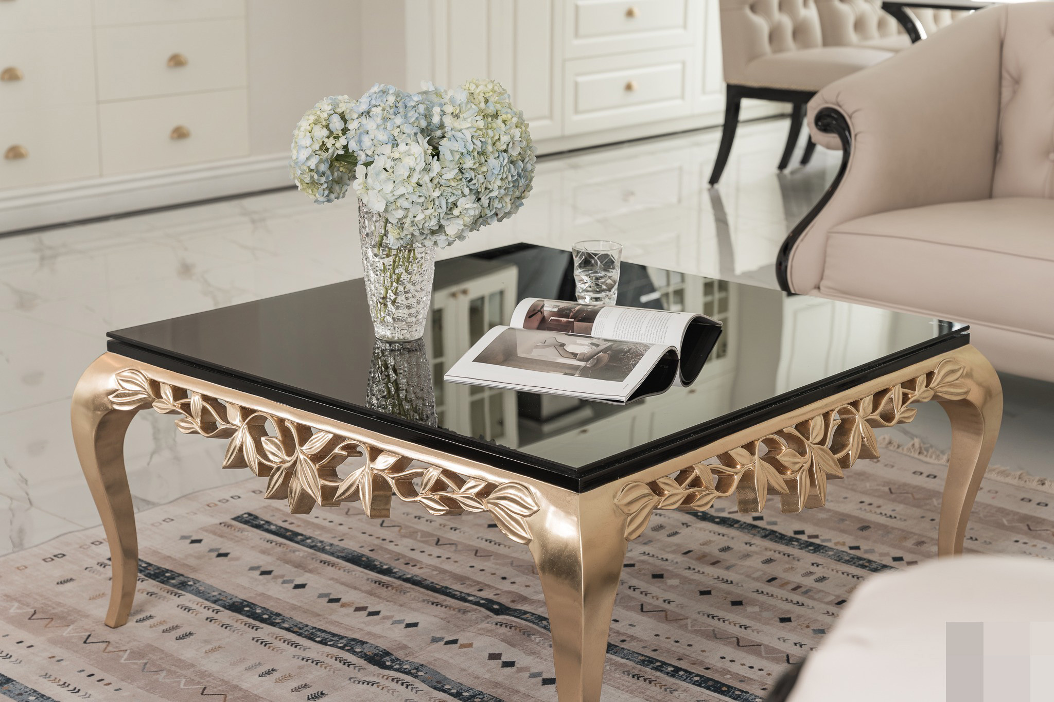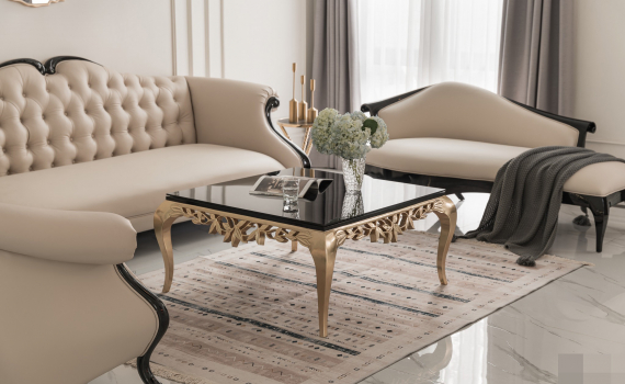Những chi tiết mạ vàng ở tay nắm cửa, ngăn kéo và bàn trà càng làm tăng thêm sự đẳng cấp.