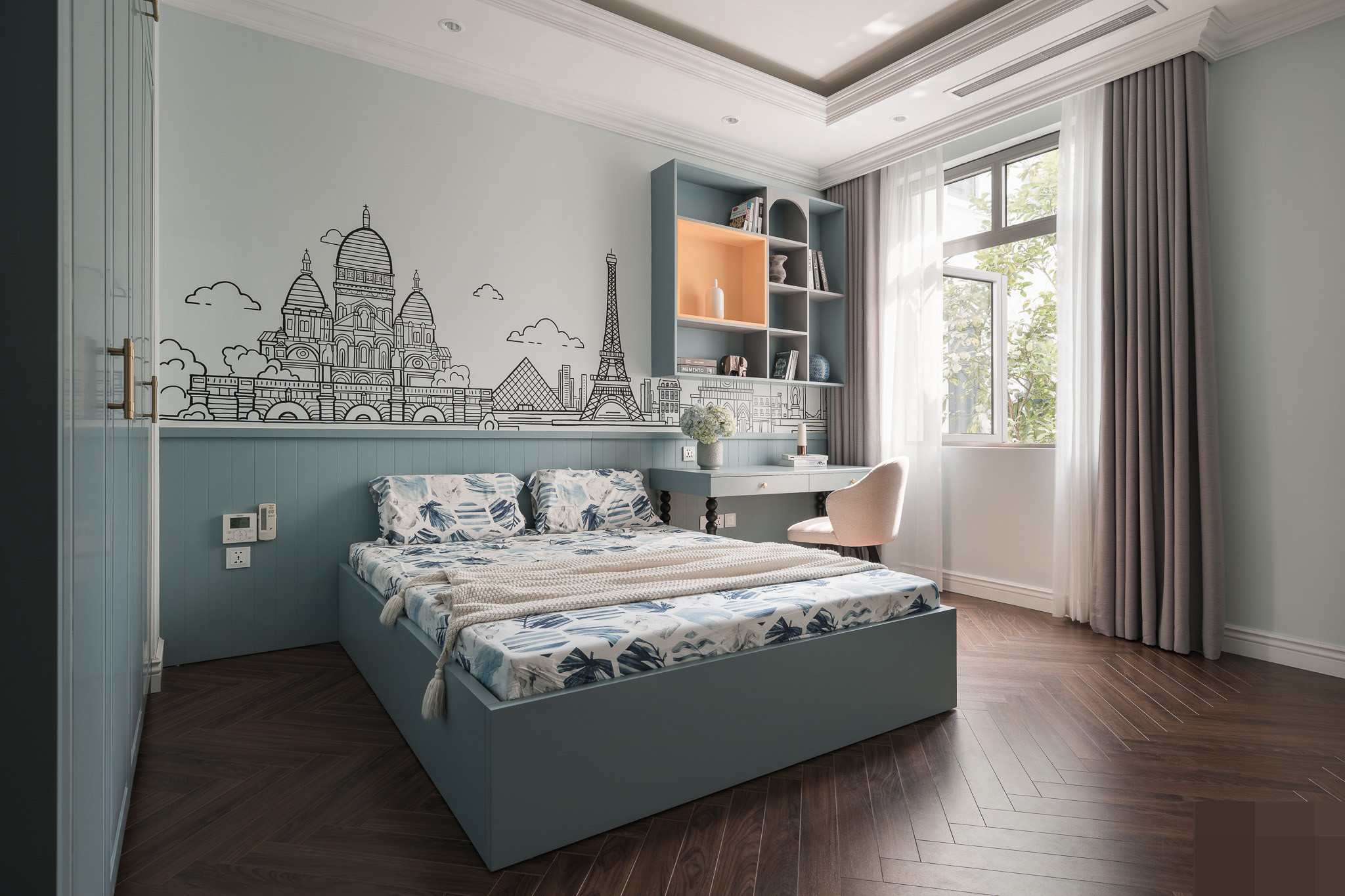 Phòng ngủ bé gái với bức tranh tường tái hiện khung cảnh Paris (Pháp) thơ mộng.