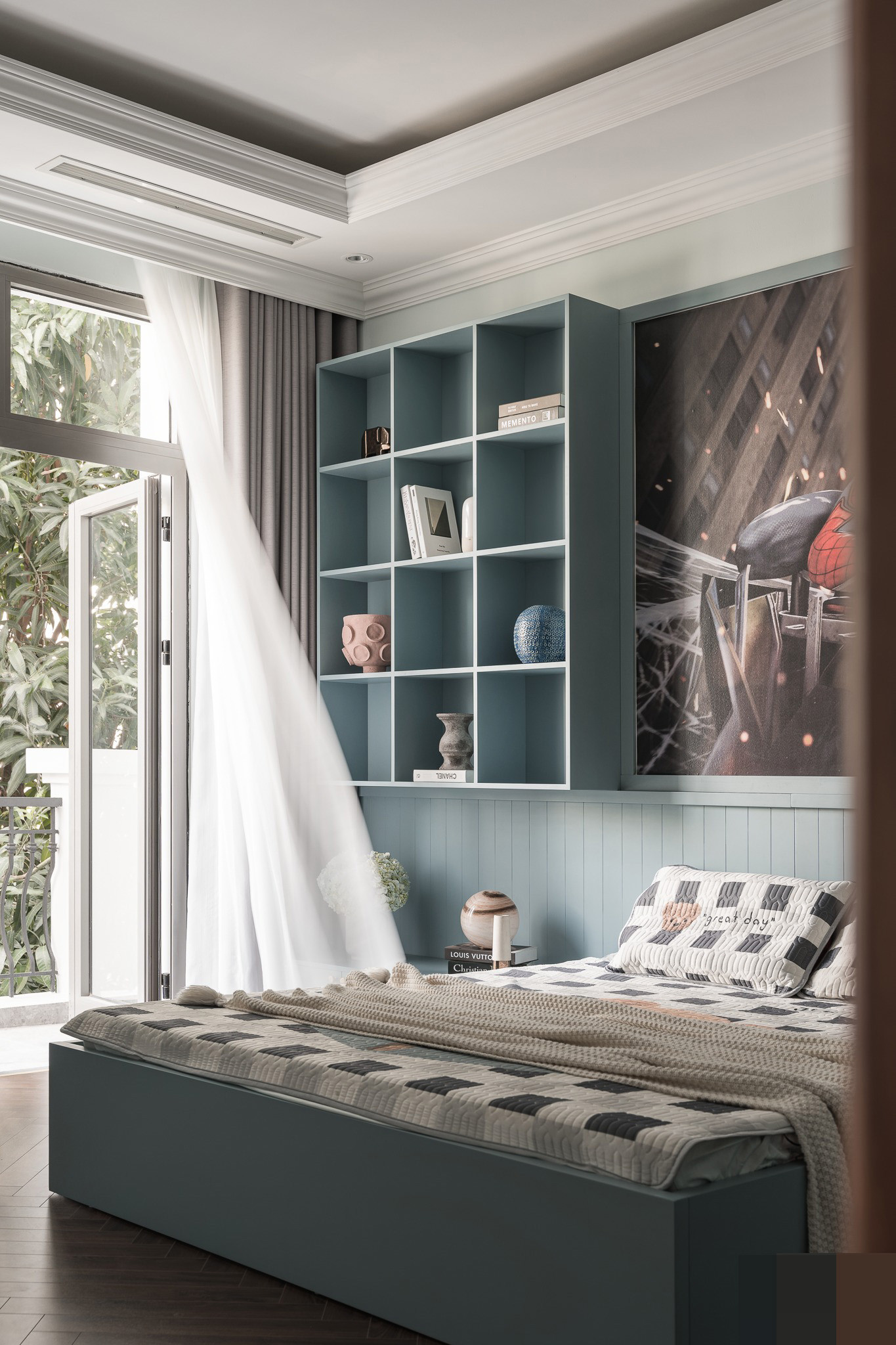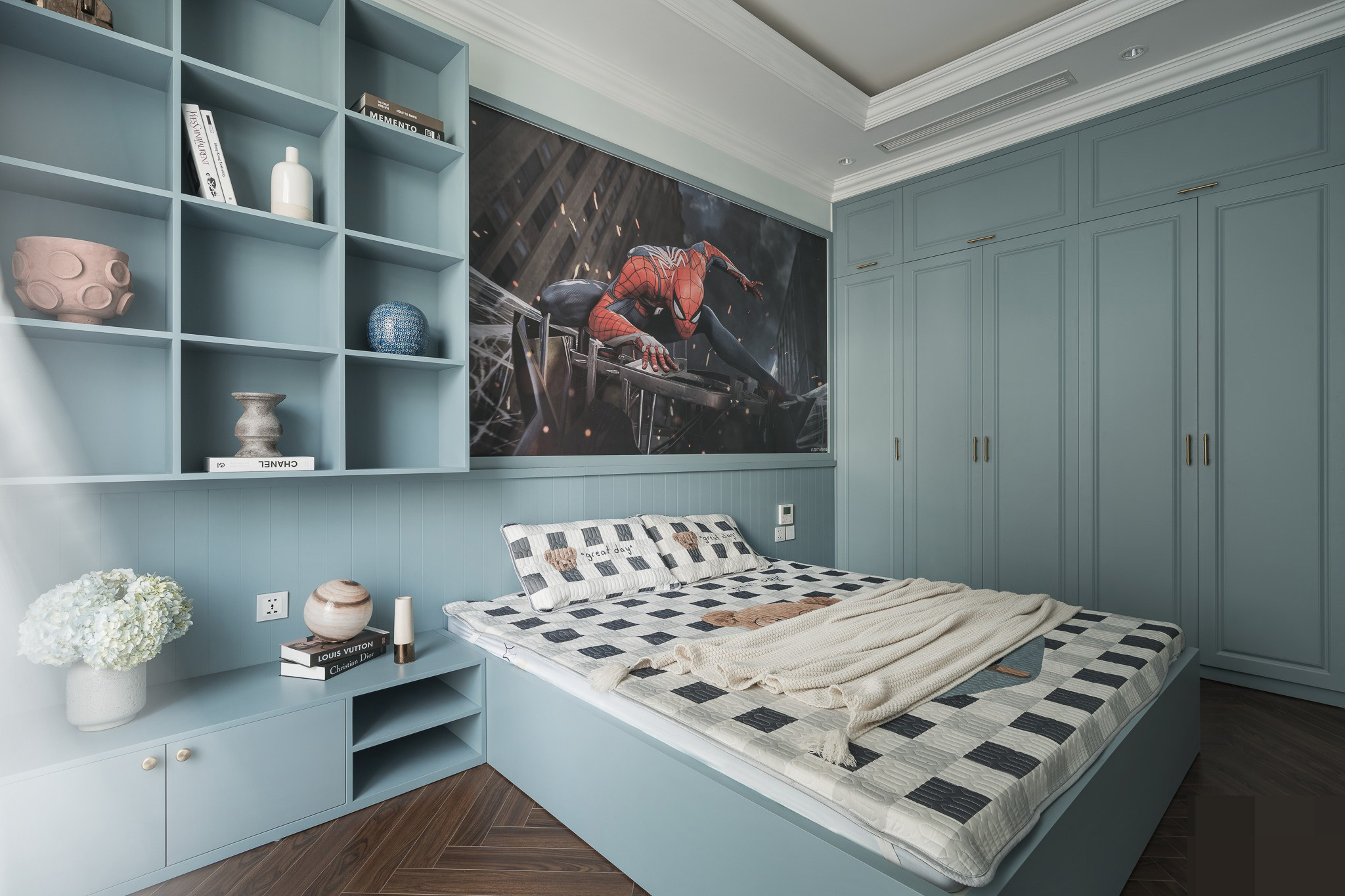 Phòng ngủ bé trai cá tính, mạnh mẽ có hình nhân vật người nhện bé yêu thích.