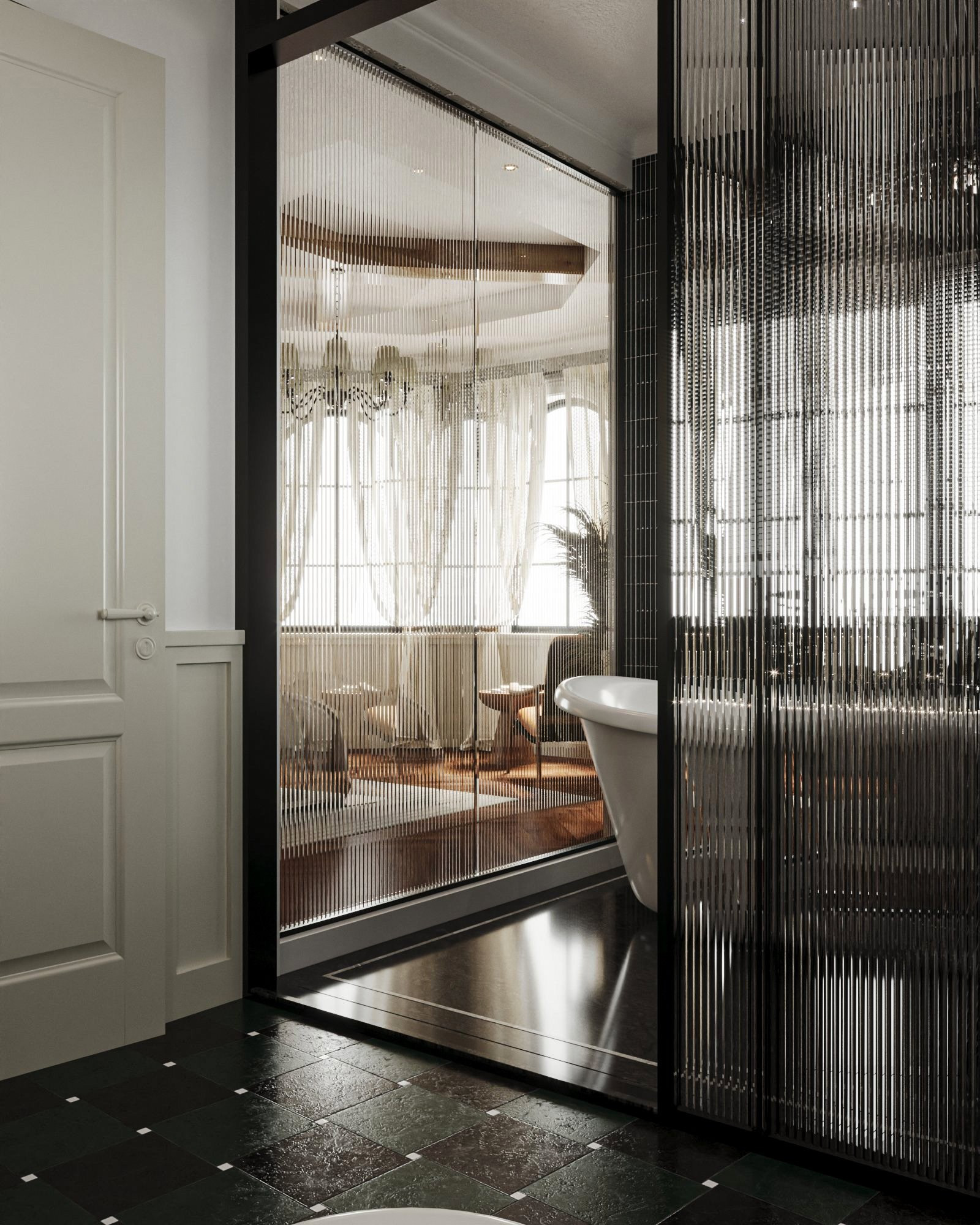 Phòng tắm master, nhóm thiết kế dùng vách kính sóng mờ để ngăn cách khu khô và ướt. Nền gạch bông màu tối sang trọng. Ngoài ra, từ bồn tắm có thể quan sát phòng ngủ nhờ vách kính.