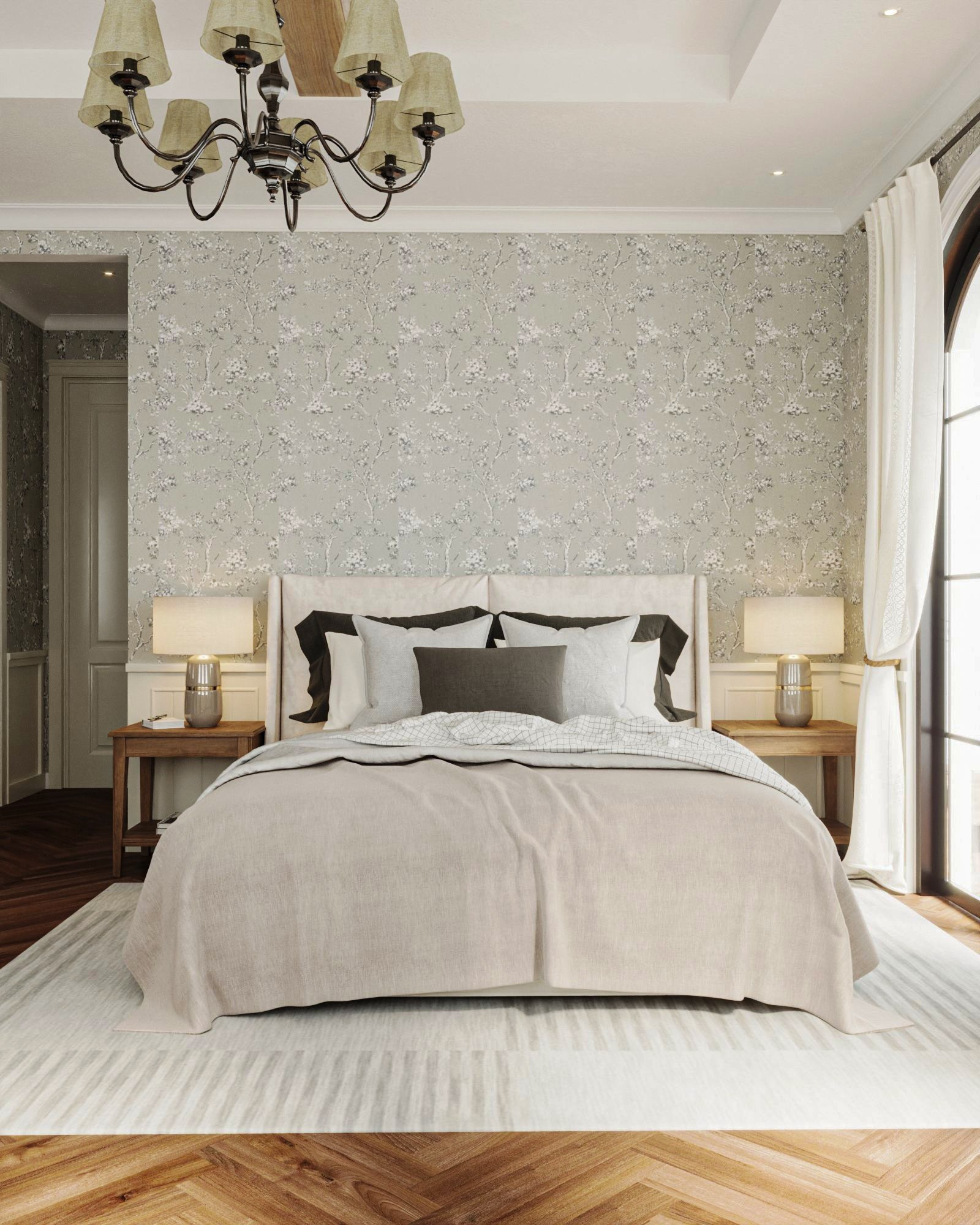 Phòng ngủ nhóm không dùng sơn mà dùng giấy dán tường họa tiết để làm tăng tính cổ điển, vintage.