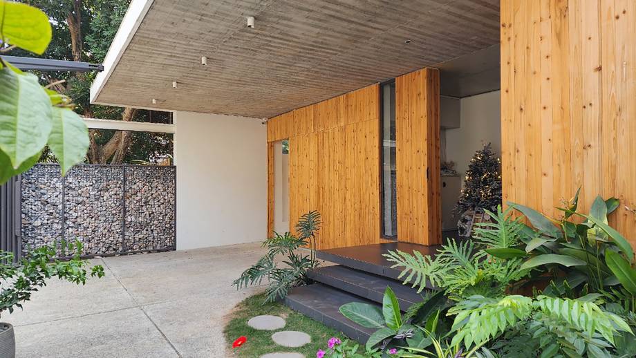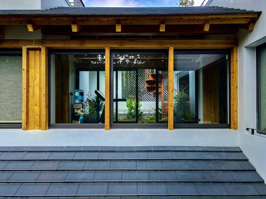 Phía trước nhà được tách riêng bằng một khoảng sân, với mái hiên bê tông vươn 4 m che mưa che nắng. Khoảng sân này vừa là không gian đệm ngăn cách ngôi nhà với bên ngoài, vừa là chỗ vui chơi cho con trẻ.
