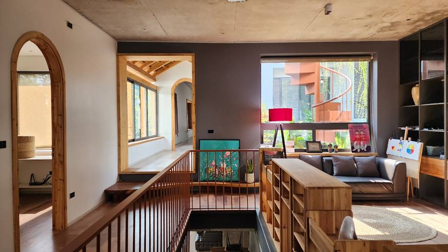 Nhà cầu mái ngói lợp ở tầng hai kết nối không gian sinh hoạt chung và phòng ngủ chính thông qua khu vườn nằm giữa tầng. Khi đi qua nhà cầu để vào phòng ngủ chính, gia chủ có cảm giác như đang đi vào một căn nhà độc lập (nhà trong nhà).
