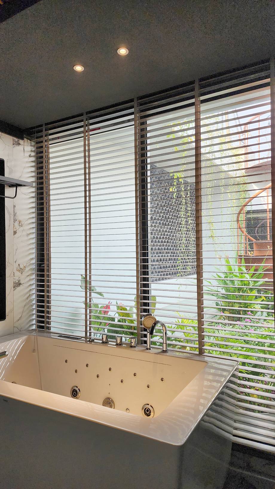 Nhà vệ sinh chỉ cách khu vườn tầng hai bằng một chiếc rèm cửa lá nhôm ngang, nhờ thế ở trong phòng tắm vẫn có thể ngắm nhìn cây xanh bên ngoài. Loại rèm này có thể xoay lật lá mành 180 độ, giúp lấy sáng, thông gió dễ dàng.