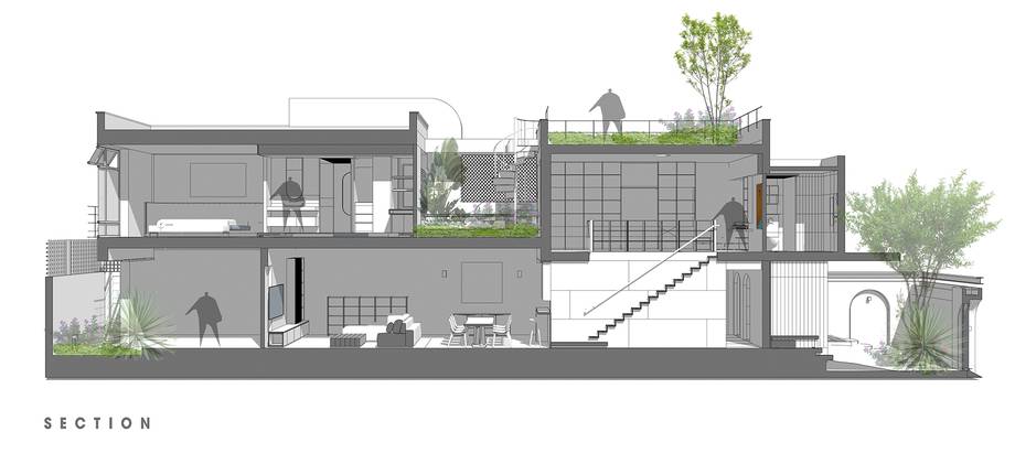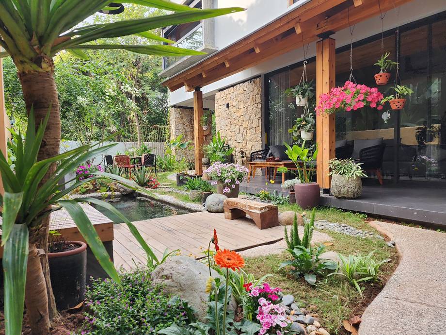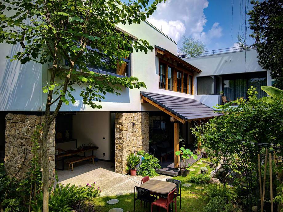 Bên trong, mọi không gian được bao quanh khoảng sân vườn rộng 240 m2 với hồ cá và cây xanh, nơi gia đình thường xuyên quây quần, tụ họp. Hồ nước nhỏ nằm giữa sân giúp điều hòa và làm mát không khí, đồng thời cân bằng được độ ẩm trong nhà. Mảng xanh bao quanh nhà tạo ra một lớp lá chắn tự nhiên trước nhiệt độ, tiếng ồn và khói bụi đồng thời giúp căn nhà có diện mạo tươi mới, đầy sức sống.