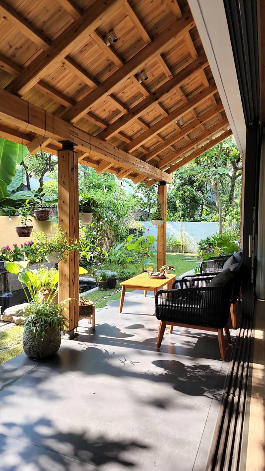 Hàng hiên thấp còn tạo cảm giác ấm cúng và gần gũi. Khu vực hiên cũng là không đệm giảm bức xạ nhiệt vào mùa hè, khiến phòng khách và phòng ăn luôn mát mẻ. Mái hiên cũng là không gian lý tưởng cho việc sinh hoạt của các thành viên nhằm kết nối, giao thoa với thiên nhiên...