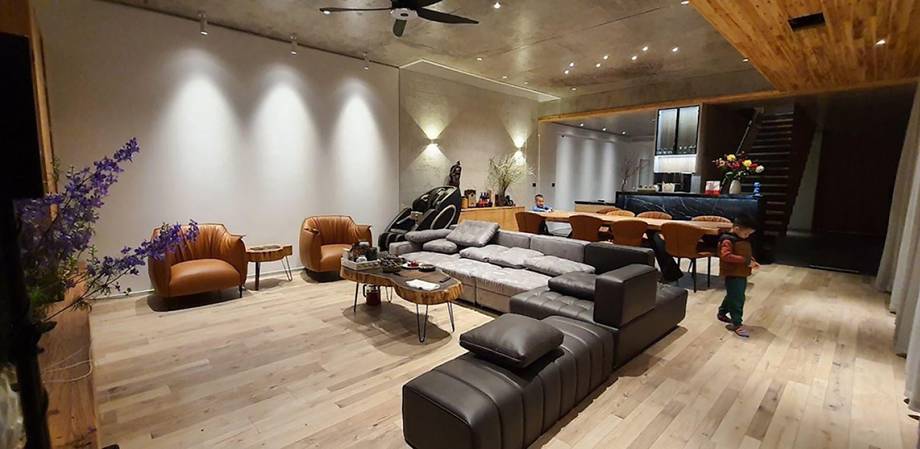 Sự kết hợp giữa gỗ Sa Mộc với trần bê tông là ý tưởng khá phổ biến trong thiết kế nội thất của phong cách hiện đại pha chút hoài cổ. Bê tông có vẻ ngoài thô sơ xám lạnh, còn gỗ lại ấm áp sắc vàng nâu. Khi kết hợp, cả hai vừa tạo sự tương phản nhưng cũng bổ sung cho nhau, tạo sự gần gũi và mộc mạc.