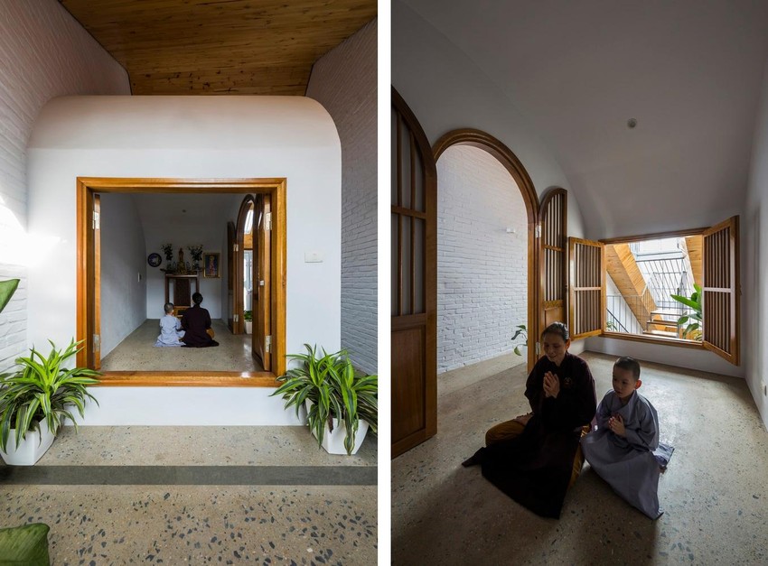 Kiến trúc sư cố gắng thiết kế một không gian thờ vẫn trang trọng nhưng dễ tiếp cận hơn, làm cho nó càng khép kín với sinh hoạt hàng ngày của gia đình càng tốt. Bàn thờ được bao quanh bởi ánh sáng tự nhiên, gió và cây xanh.