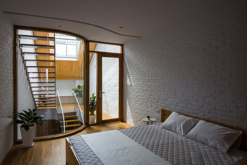 Phòng ngủ tầng một và tầng ba linh hoạt đóng mở với không gian chung bằng rèm để ngôi nhà có cảm giác rộng mở dù diện tích sàn hạn chế.