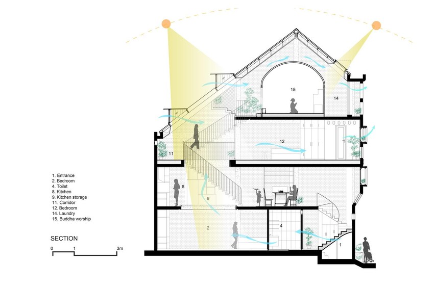 Hai cửa sổ được lắp đèn phía trên giúp kiểm soát gió vào nhà. Cầu thang và hành lang chính tập trung ở phía sau này và làm cho không gian được lưu thông liên tục từ không gian tầng dưới lên phòng thờ.