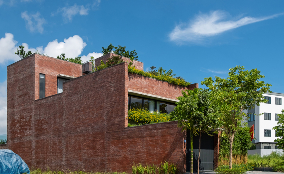 Nhà gạch đỏ với ba lớp cây xanh
