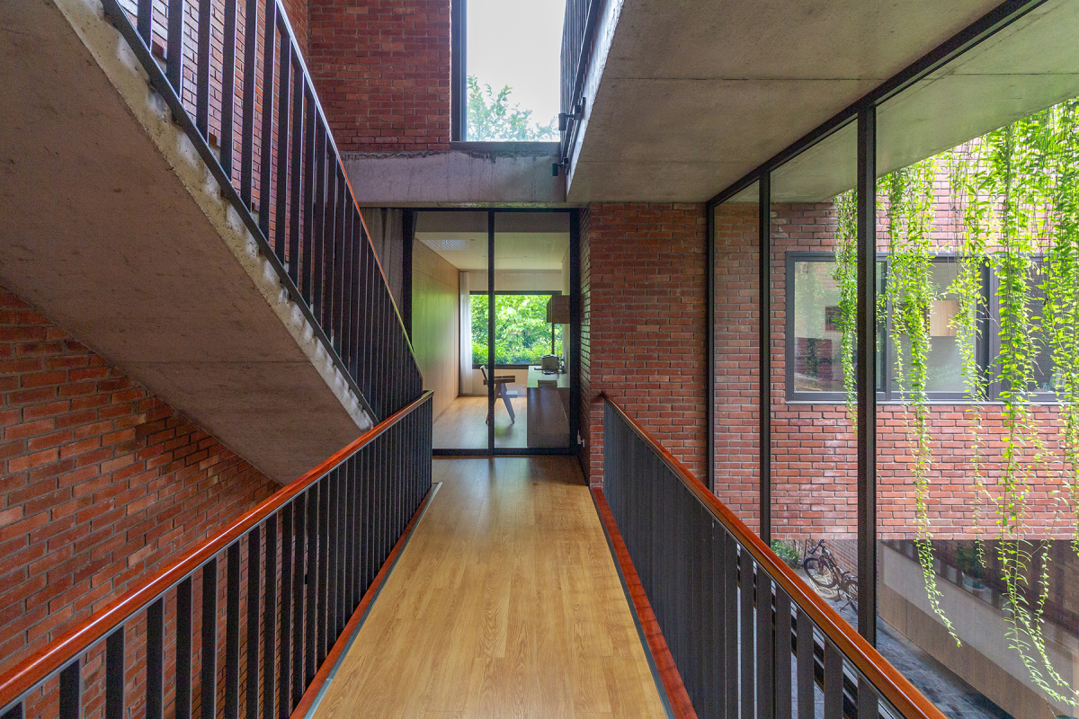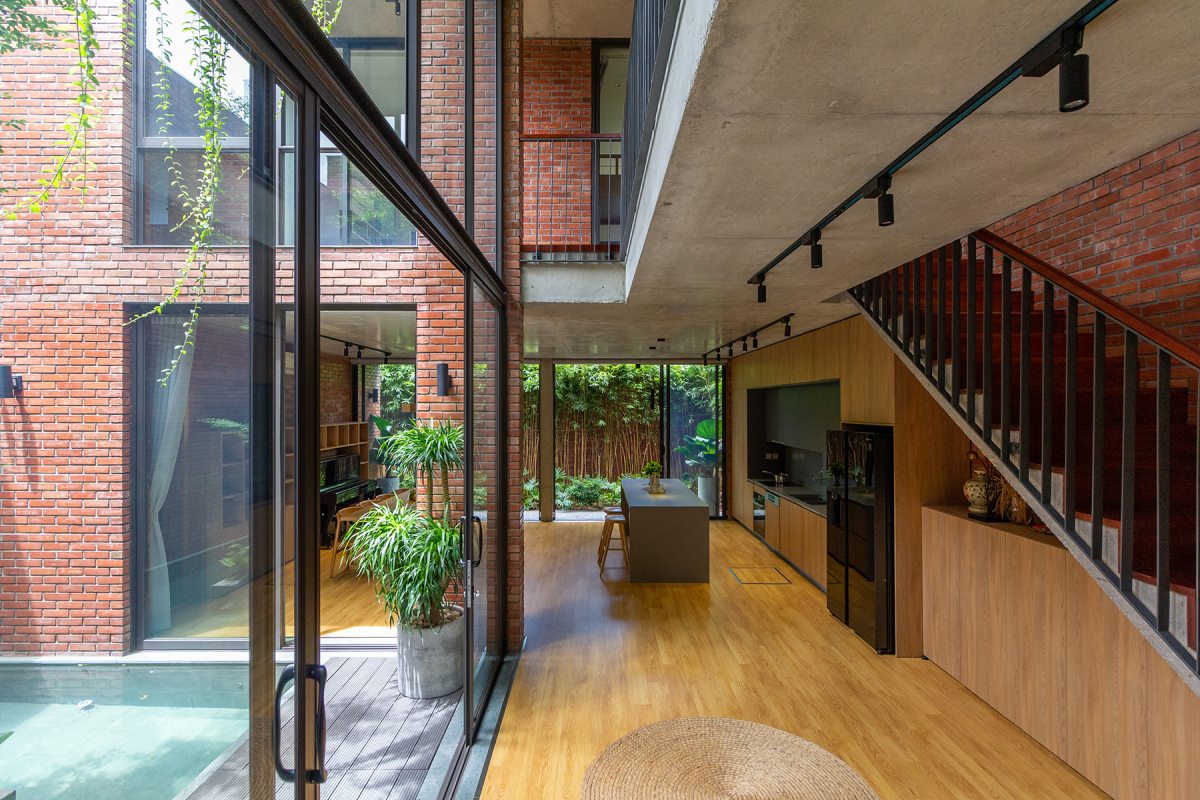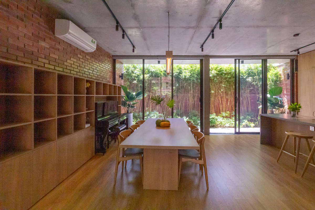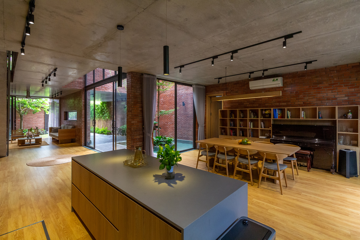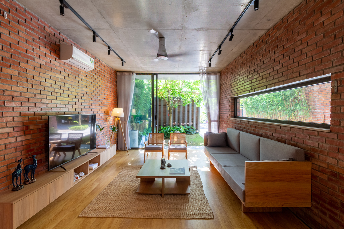 Phòng khách được bố trí gần với cửa chính, tạo thuận lợi cho khách ra vào, cũng như đảm bảo tính riêng tư cho các phòng công năng khác. Vật liệu chính trong nhà là gạch đỏ và bê tông trần, gợi cảm xúc mộc mạc, gần gũi với thiên nhiên và giảm việc bảo trì thường xuyên theo thời gian sử dụng.