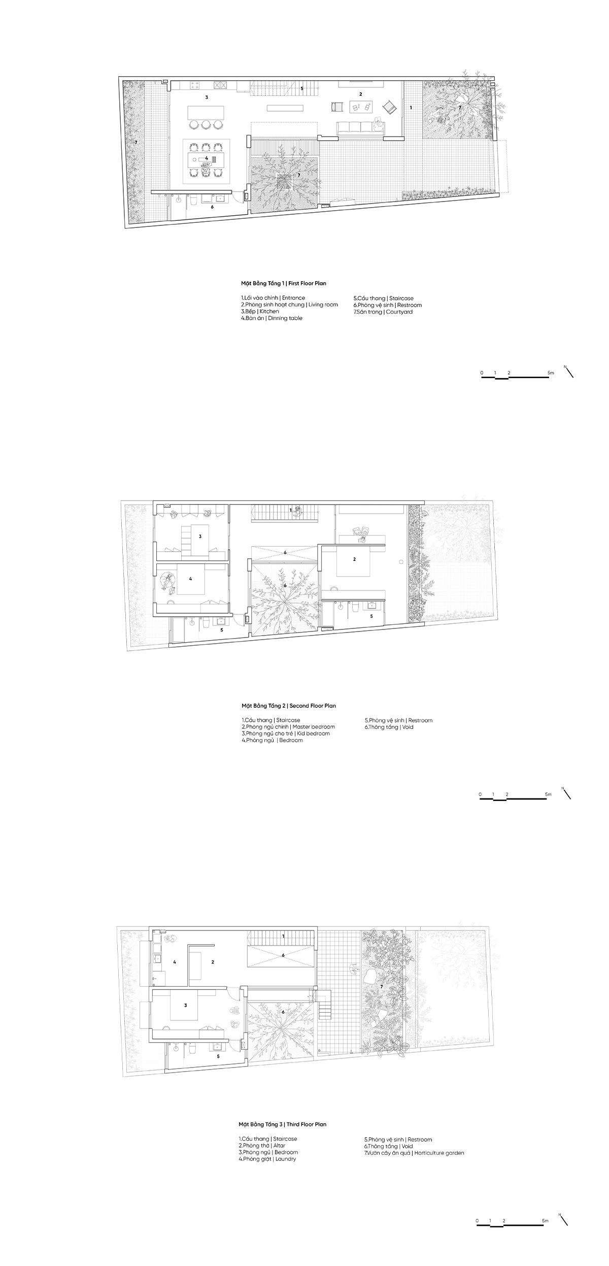 Tầng một là không gian sinh hoạt chung gồm phòng khách, bếp, ăn, vệ sinh… Các không gian được bố trí giữa những khoảng vườn và hồ nước tĩnh lặng. Hệ cửa kính kéo dài từ sàn đến trần cho phép ánh sáng tự nhiên tràn vào không gian nội thất, khiến người sống trong nhà như được bao bọc bởi thiên nhiên xanh mát.