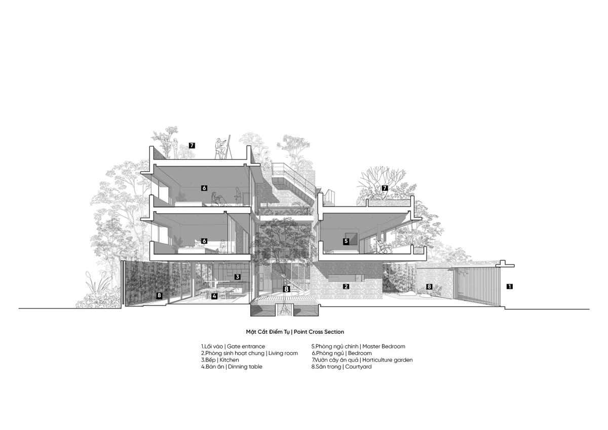 Tận dụng lợi thế khu đất mặt tiền 8 m, sâu 25 m, các kiến trúc sư lên ý tưởng về một ngôi nhà với nhiều lớp không gian từ ngoài vào trong. Theo đó khu đất được chia thành 5 phần với các chức năng khác nhau, trong đó hai phần giữa là không gian ở, còn lại dành cho cây xanh và mặt nước. Nhờ cách phân chia này, xuyên suốt từ ngoài vào trong là các lớp không gian ở và cây xanh đan xen. Mỗi không gian ở đều có hai mặt thoáng là cây xanh và mặt nước.