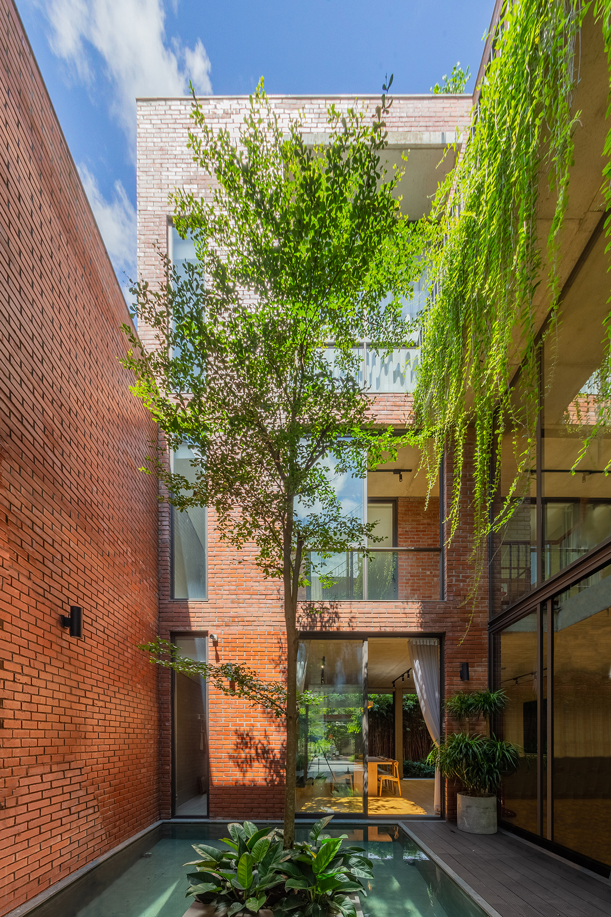 Ngay từ mặt tiền, ngôi nhà nổi bật với nền gạch đỏ kết hợp với màu xanh của cây cỏ. Để tạo không gian mát lành cho ngôi nhà, kiến trúc sư đã sử dụng cây cối tạo thành những bức tường xanh che nắng, vừa tránh nắng nóng vừa chống ồn từ xe cộ bên ngoài.