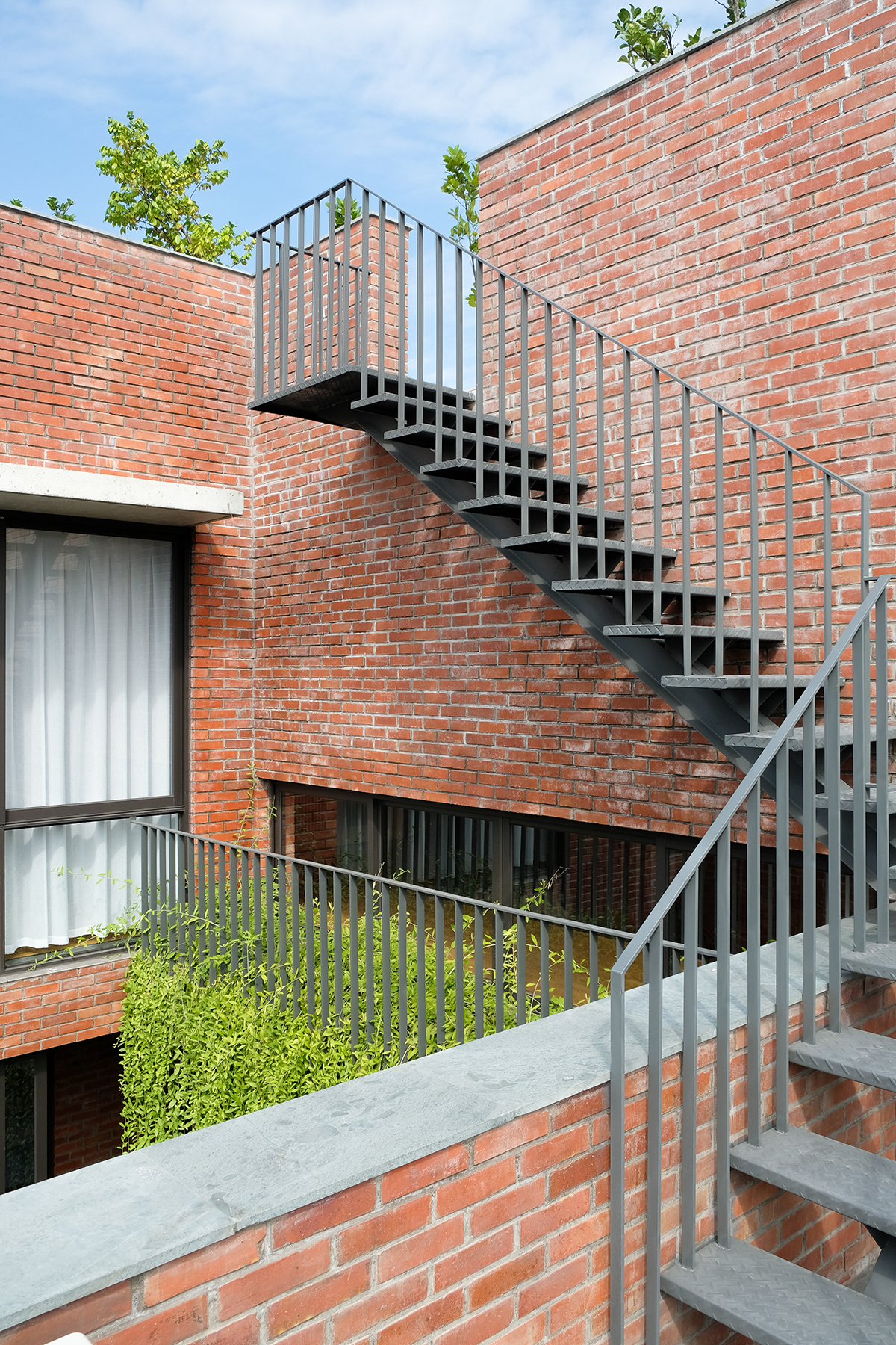 Hệ cầu thang là trục chính xuyên suốt từ trên xuống dưới vừa mang công năng giao thông, chuyển ánh sáng và điều hoà không khí vừa là hình khối trang trí cho bố cục căn nhà.