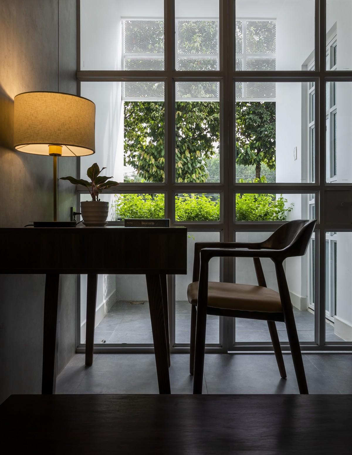 Giải pháp thứ ba là kiến trúc sư bố trí công năng để thiết lập hai trục thông thoáng tự nhiên theo phương đứng và phương ngang. Theo đó, tất cả các không gian trong nhà phố đều được thông thoáng tự nhiên.
