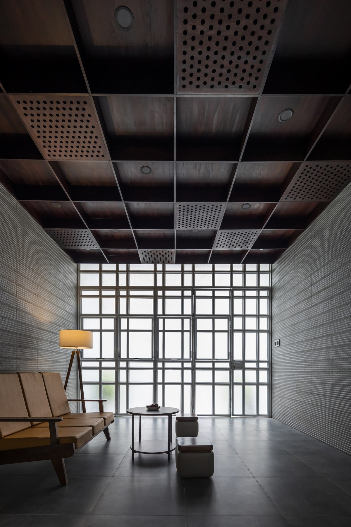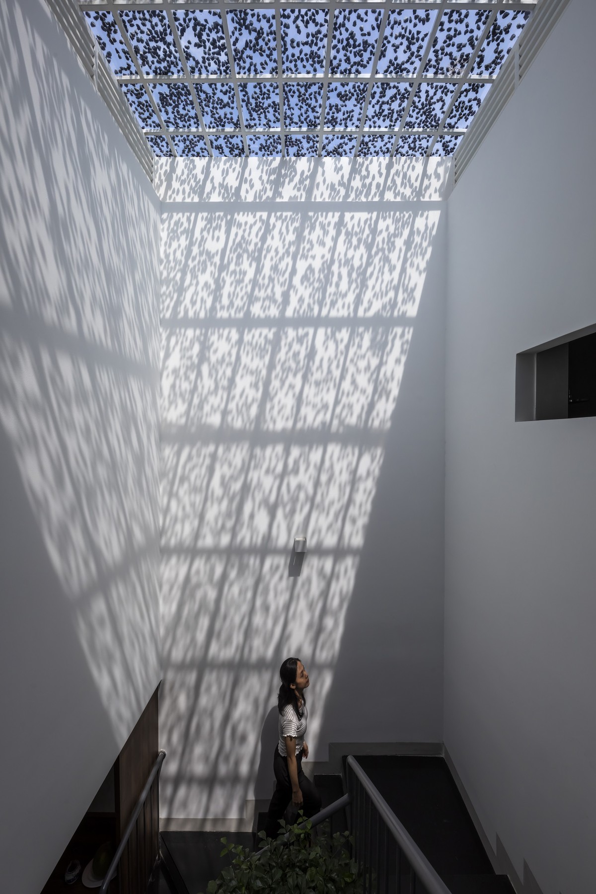 Hệ lam chữ Z bố trí ở phía trên giếng trời giúp thoát khí nóng, từ đó làm giảm áp suất bên dưới mái kính. Không khí vào nhà từ hai hệ cửa trước và sau, tạo ra dòng đối lưu luân chuyển qua mọi không gian.
