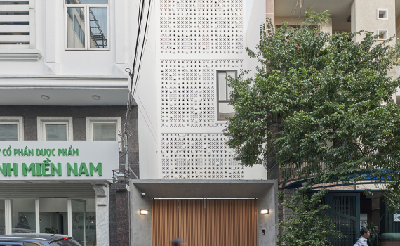 Căn nhà hướng chính Tây. Để hạn chế nắng nóng chiếu trực tiếp, toàn bộ mặt tiền sử dụng gạch bông gió, giúp ngôi nhà một trệt ba lầu như được phủ bởi một hệ thống rèm ngăn cản ánh nắng nhưng vẫn có thể lấy được gió và ánh sáng tự nhiên.