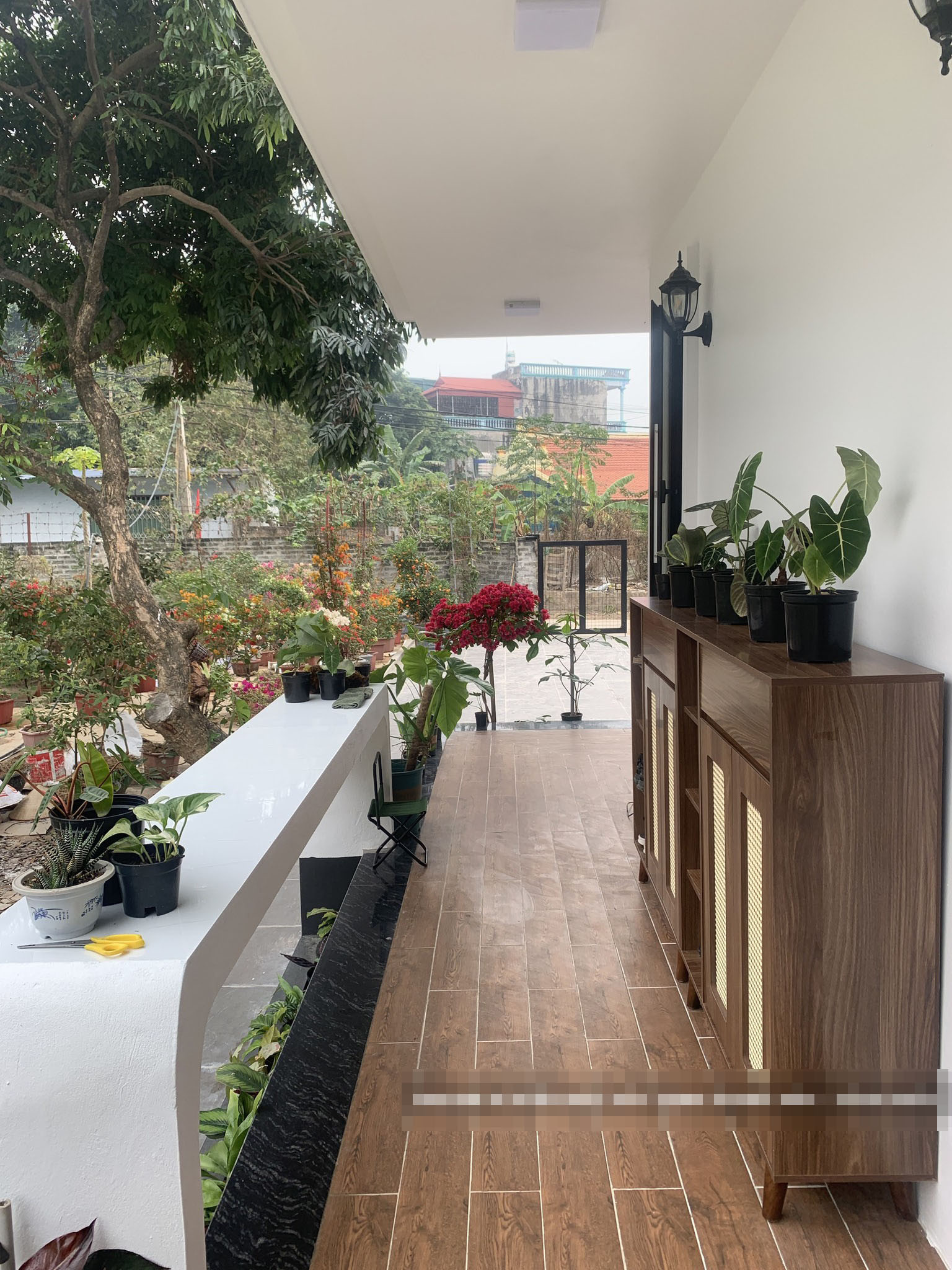 Các hệ cửa đều dùng cửa thép vân gỗ màu óc chó, cửa sổ 100% dùng nhôm kính. Hiên phía trước rộng 2m và bên phụ là 1m6 nên không ngại mưa nắng.