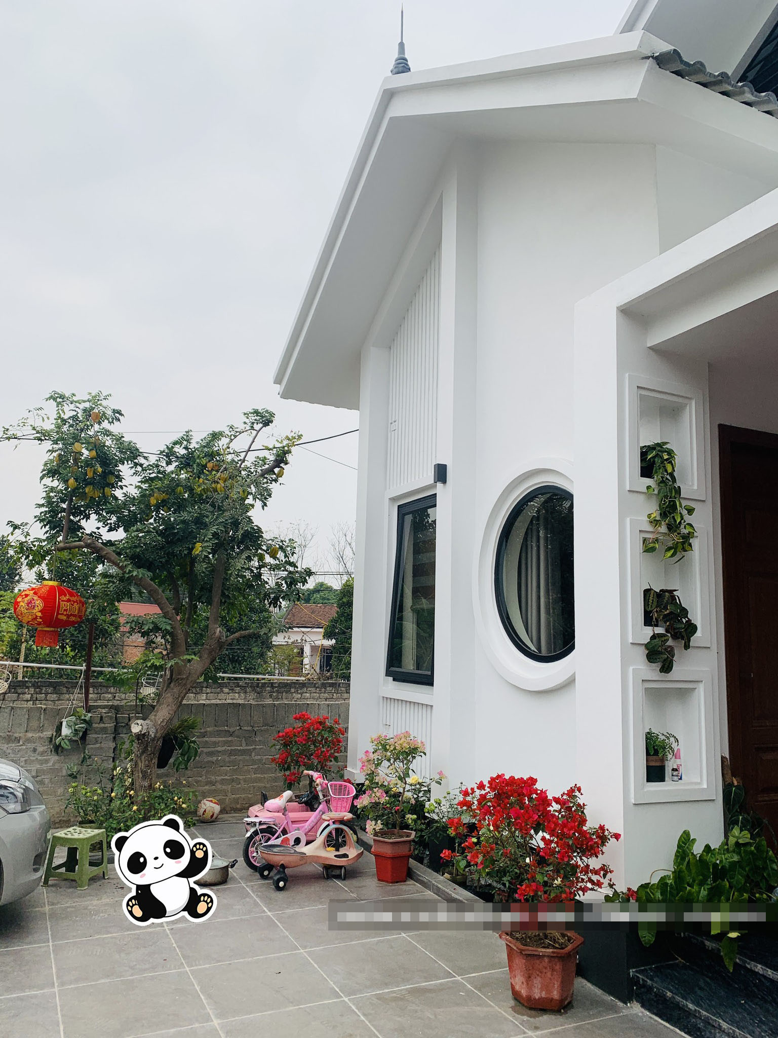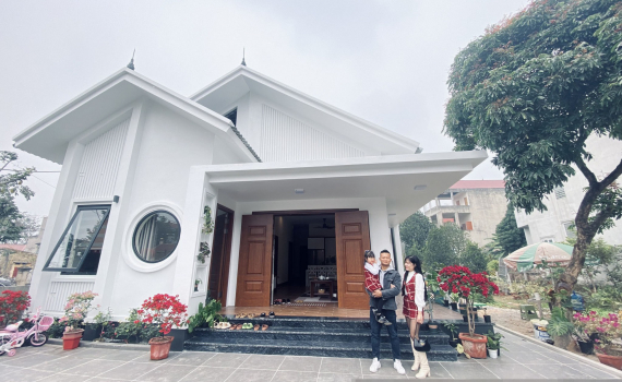 Bức ảnh đầu tiên của gia đình trong năm 2023 với ngôi nhà mới. Mặt tiền nhà với màu sơn trắng, mái ngói xanh lam và hàng hiên rộng.