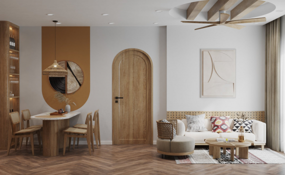 Góc phòng khách nhìn từ bàn ăn. Đối với phong cách Wabi Sabi thì gam màu nóng dường như không xuất hiện trong mẫu thiết kế này. Bản chất của phong cách này là đem đến vẻ đẹp êm dịu, lắng đọng.