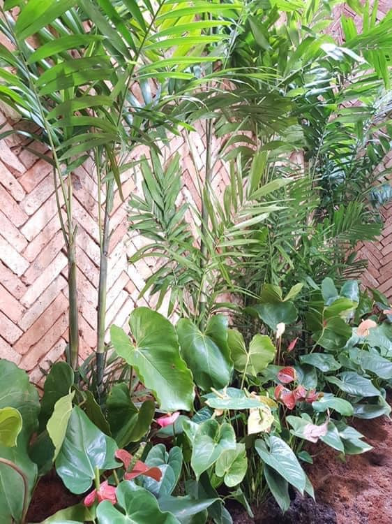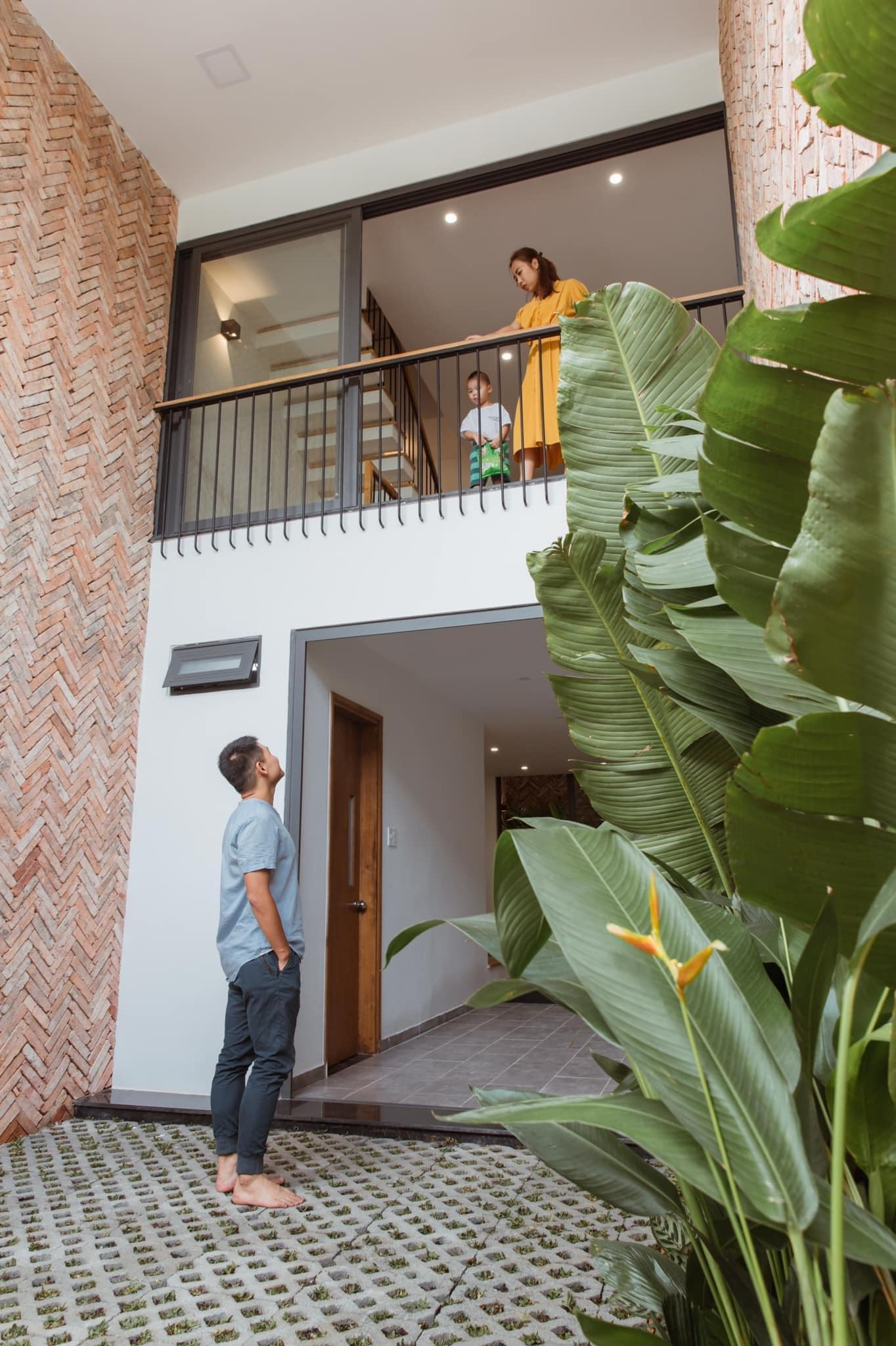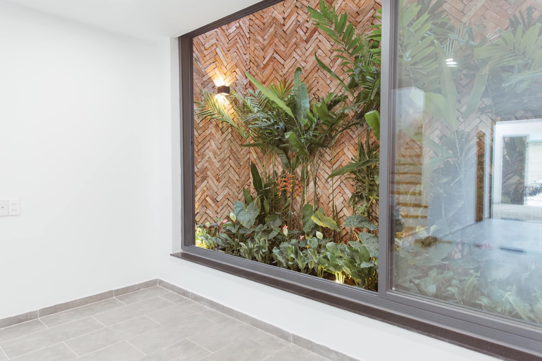 Khoảng sân trước nhà với mảng tường ốp gạch đỏ mộc kiểu xương cá. Một bên là hàng cây chuối cảnh và cây nhiệt đới lọc bụi. Nền sân ốp gạch lỗ, trồng thêm cỏ. Những ngôi nhà phố có diện tích lớn một chút, có thể xây lùi vào trong như thế này để làm sân cổng và chỗ để xe, trồng cây.