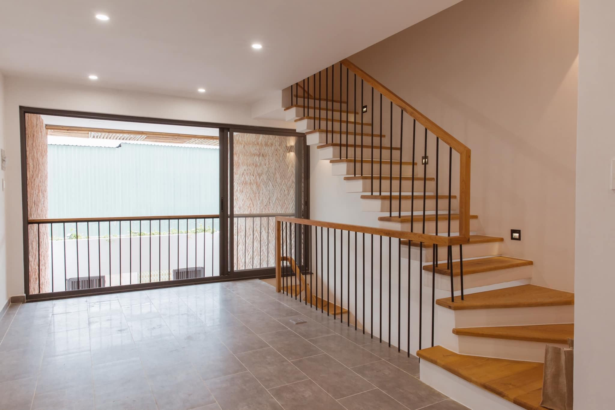 Tầng lửng có ban công rộng, dễ dàng giao lưu với phía dưới nhờ khung cửa lớn. Lớp rào ban công có khe hở hẹp và tính toán để đảm bảo an toàn cho trẻ nhỏ.
