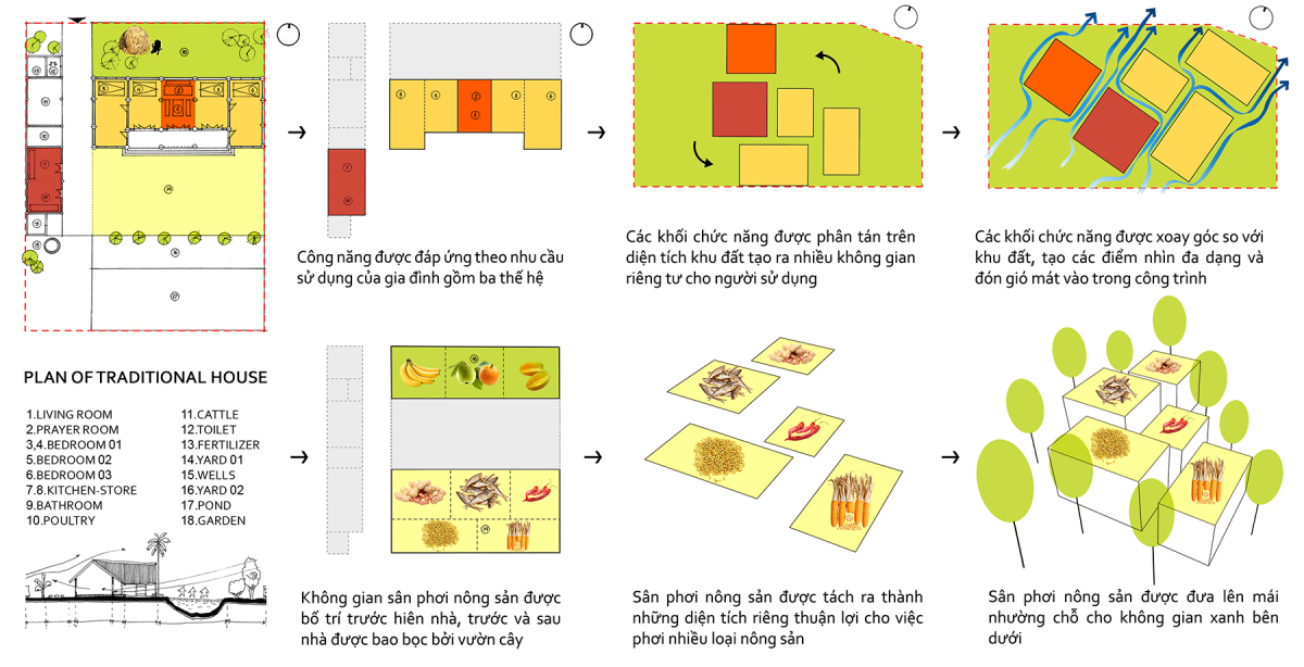 Công trình được chia thành 5 khối độc lập, tương ứng với năm khu vực công năng cần thiết của gia đình: Phòng sinh hoạt chung, bếp ăn, ba phòng ngủ, kho đựng dụng cụ nông sản và nhà vệ sinh.