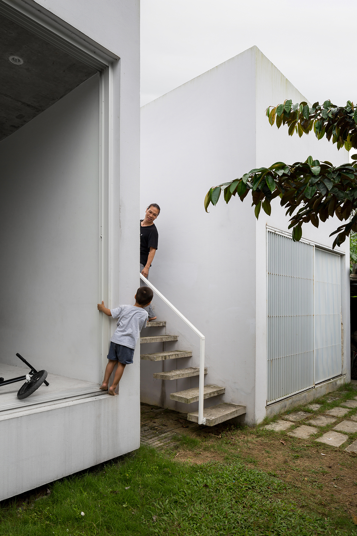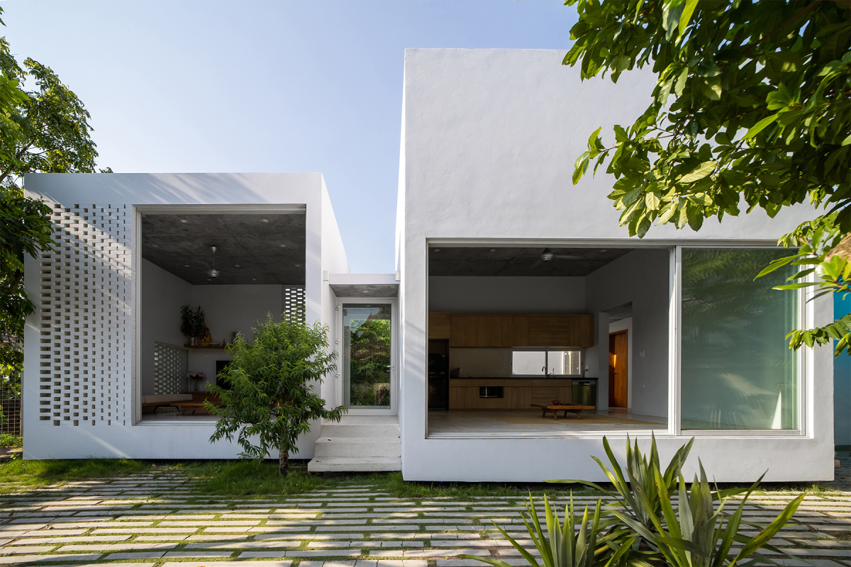 Những khối nhà được kết nối với nhau bởi hành lang và được xoay góc so với hướng đất, đưa mặt tiền chính của ngôi nhà về hướng Nam để đón gió mát.