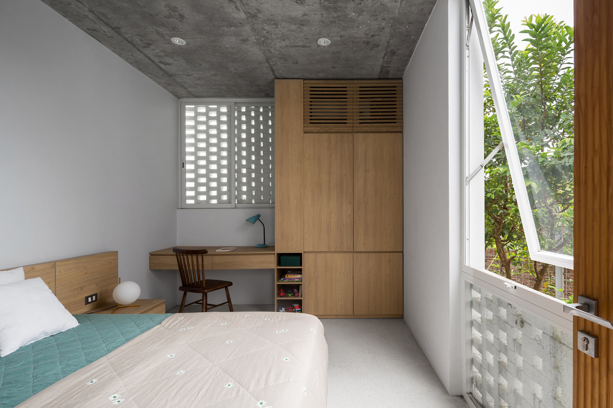 Những tủ đồ được thiết kế âm tường nhằm tối đa hóa diện tích sử dụng. Không gian bên trong được kết nối với sân vườn qua hệ cửa kính khiến ngôi nhà luôn tràn ngập ánh sáng tự nhiên, hạn chế tối đa sử dụng ánh sáng nhân tạo.