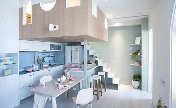 Vì trần có lợi thế cao 3,3 mét nên phía trên phòng bếp được thiết kế gác lửng, là nơi được bố mẹ tạo phòng vui chơi, và cũng là nơi ngủ của cậu con trai.