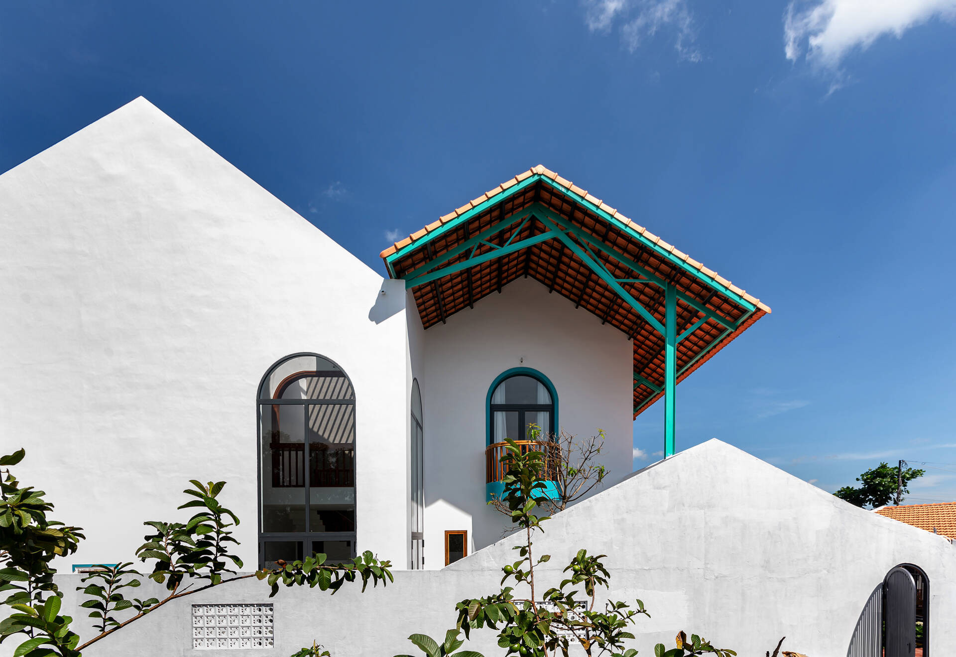 Nhà nổi bật với mái ngói đỏ truyền thống và vật liệu địa phương, phù hợp với cảnh quan xung quanh và nhịp điệu của núi đồi, nhưng đã được cách điệu một vài chi tiết để tạo ra sự mới mẻ và thú vị cho ngôi nhà.