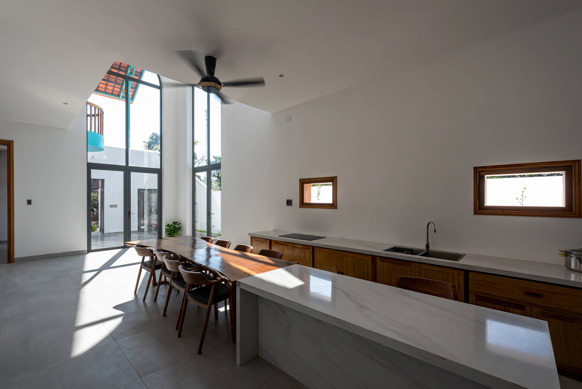 Nội thất của khối nhà chính chủ yếu dùng vật liệu gỗ tự nhiên truyền thống của khu vực địa phương, nhưng được thiết kế đơn giản, hiện đại để không gian nhẹ nhàng và thông thoáng.