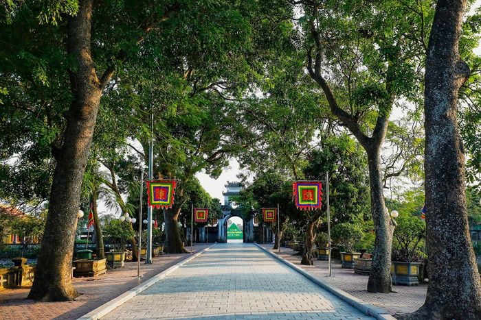 Đền có cửa chính cao hai tầng, tầng dưới uốn thành hình vòm trang trí hoa văn xung quanh.