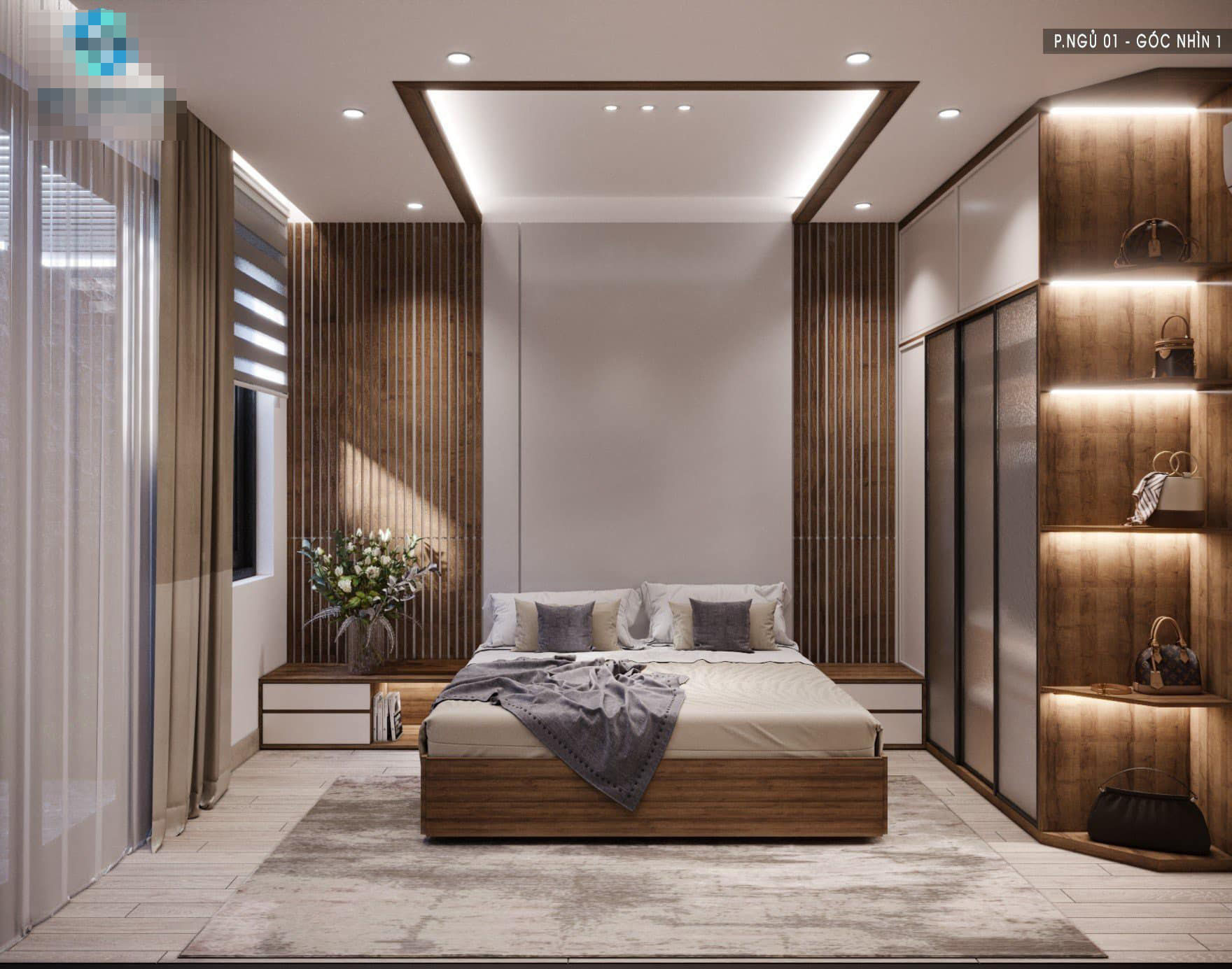 Phòng ngủ dùng gam trắng và nâu gỗ tối giản, ấm cúng.