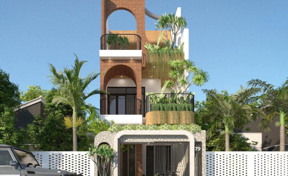 Ngôi nhà tầng có sân cổng để xe. Bụi cúc tần Ấn Độ theo thời gian sẽ phát triển và rủ xuống như lớp rèm cản tia bức xạ mặt trời. Tầng ba trồng một cây thần tài núi để cảnh quan thêm đẹp. Những bức tường vòm giúp làm mềm mại sự thô cứng của bê tông và hình khối.