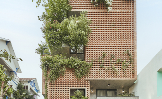 Điểm nhấn của ngôi nhà 5 tầng là mặt tiền sử dụng 25.000 viên gạch xếp so le tạo nhiều lỗ thở, giúp cản bớt nắng gắt, lưu thông không khí, đón gió vào không gian bên trong. Thiết kế này giúp căn nhà nổi bật giữa khu phố mà vẫn mộc mạc, gần gũi.