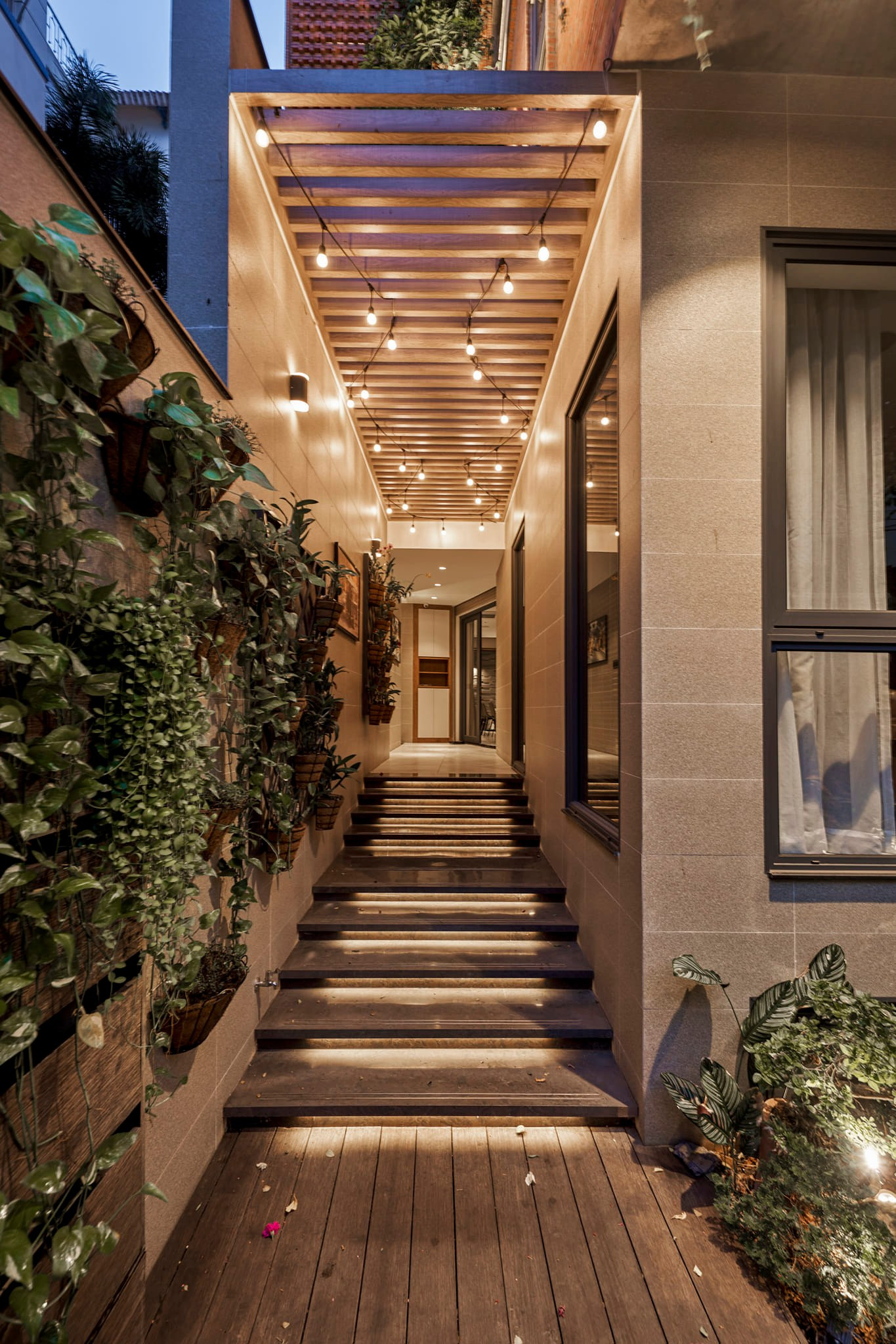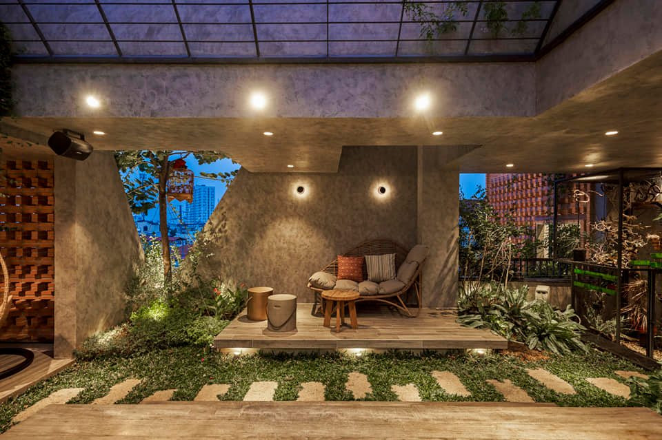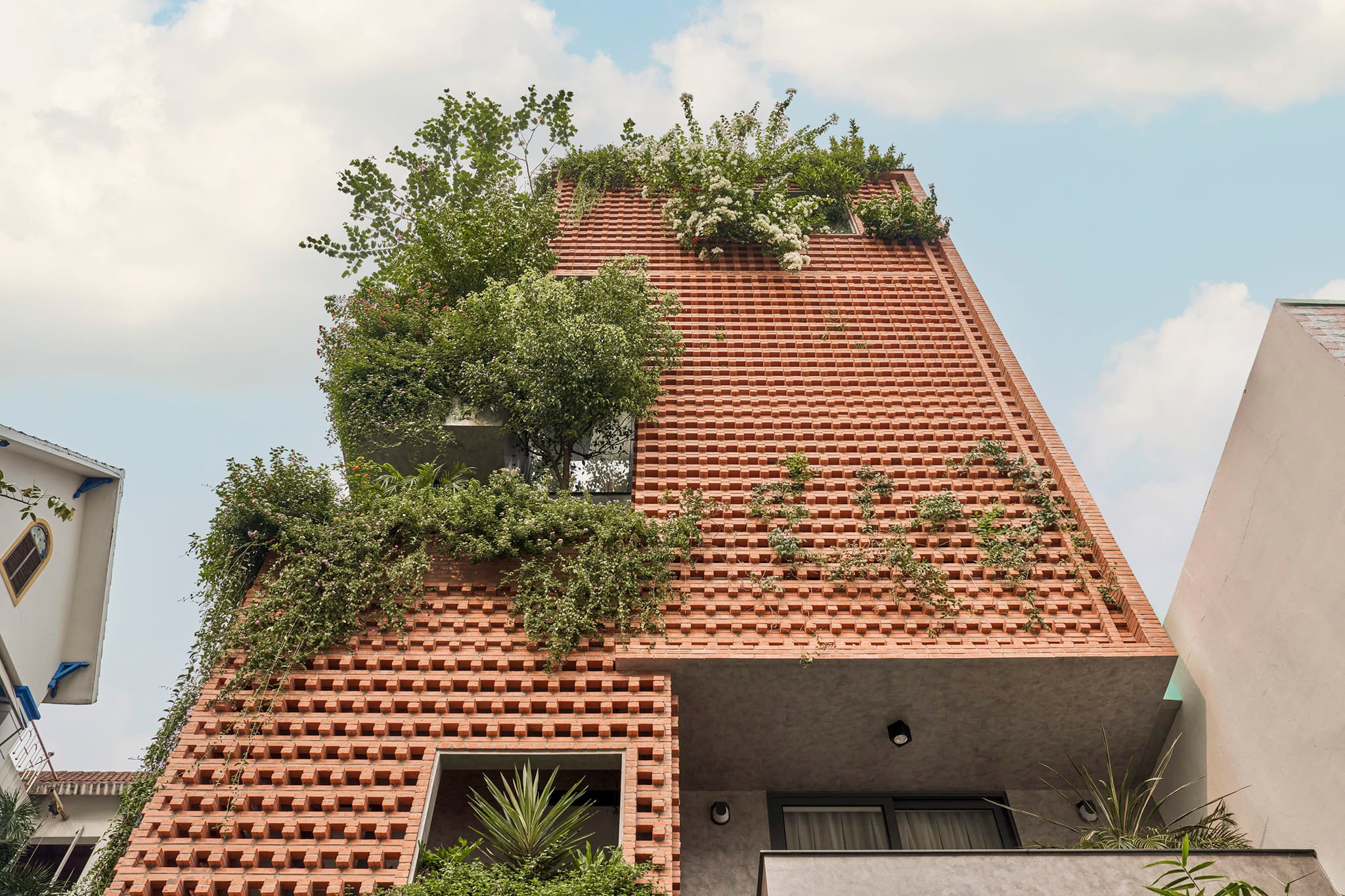 ừng viên gạch được xây tỉ mẩn. Nhìn từ ngoài vào, ta cảm giác đây là tổ ong lớn. Hệ cây xanh bung ra từ ban công và mái nhà tạo nên mặt tiền đầy thú vị.