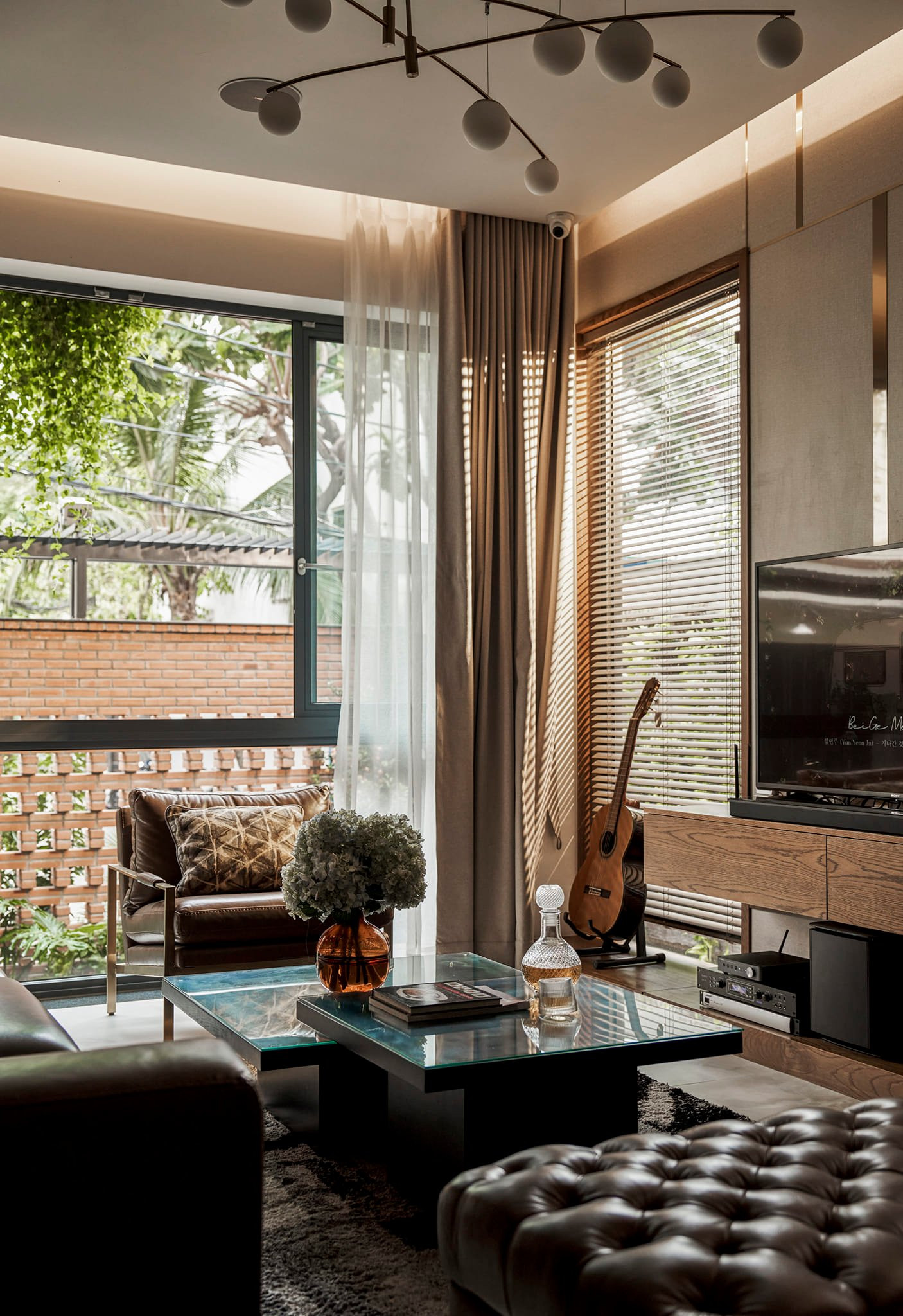 Màu sắn nội thất mang gam trầm, hài hòa với nền gạch đỏ mộc. Một thiết kế vừa mang hơi thở làng quê nhưng cũng không kém phần tiện nghi, hiện đại.