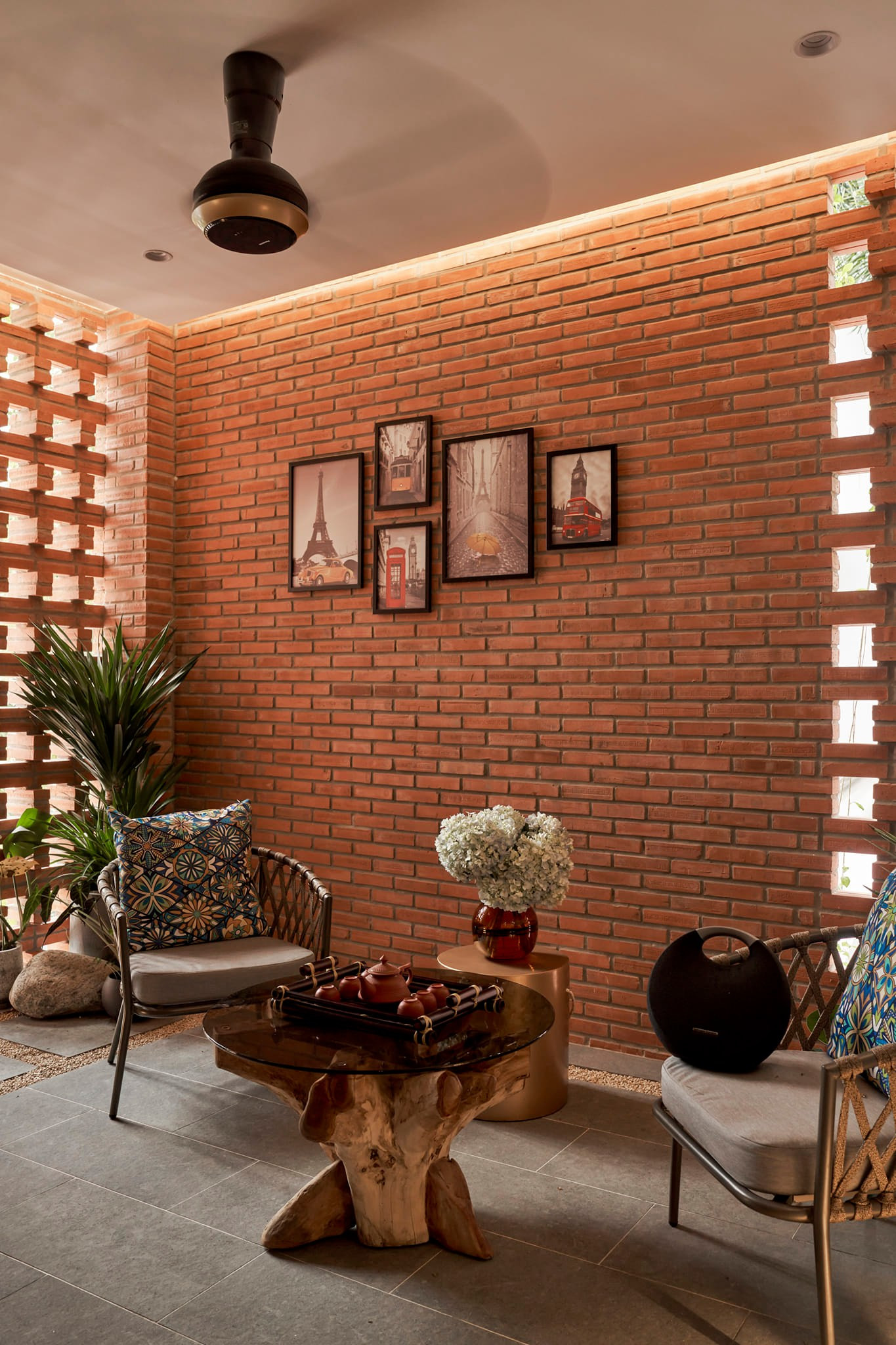 Ngôi nhà có mặt tiền khá lạ với gạch mộc đỏ xếp chồng, tạo ra những lỗ thoáng hút gió, đồng thời giúp cản nắng phía Tây.