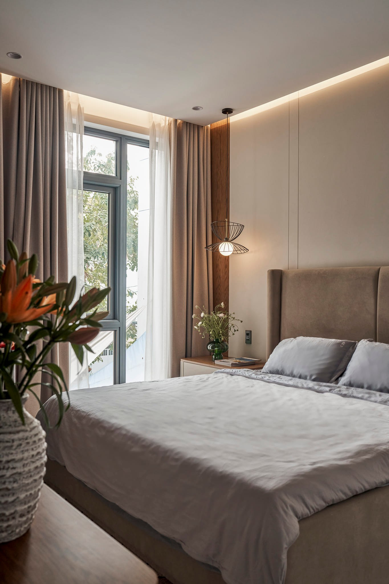 Phòng ngủ master theo lối hiện đại pha một chút vintage. Góc làm việc ngăn với giường chỉ bằng tấm bình phong mỏng những vẫn tạo ra sự riêng tư cần thiết.