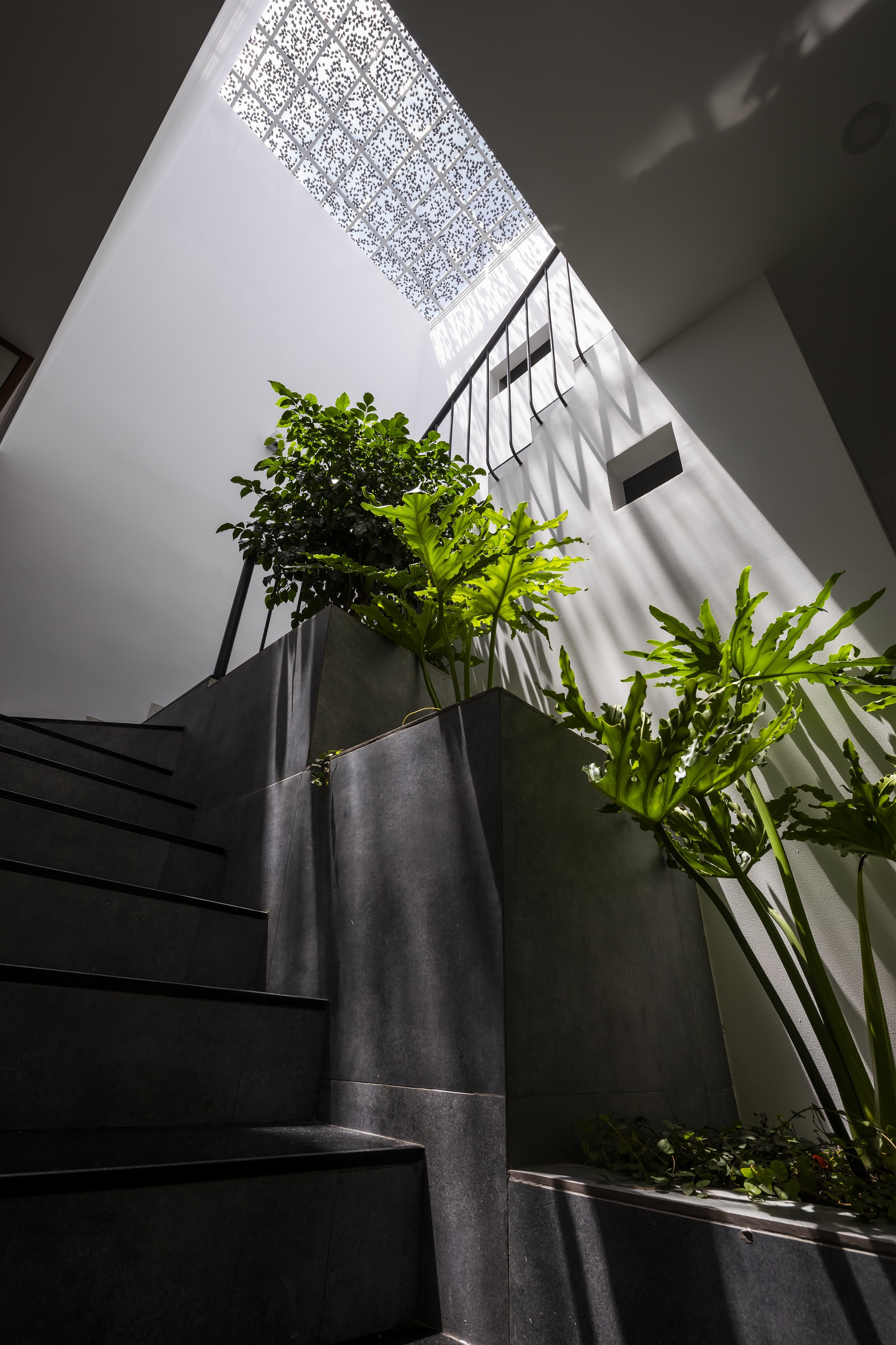 Căn nhà sử dụng kính solar để giảm 40-45 % lượng nhiệt cho khu vực giếng trời đồng thời điều tiết ánh sáng, tạo bóng mát bằng giải pháp rải đá mi phía trên kính.