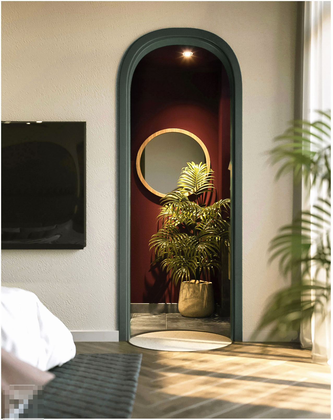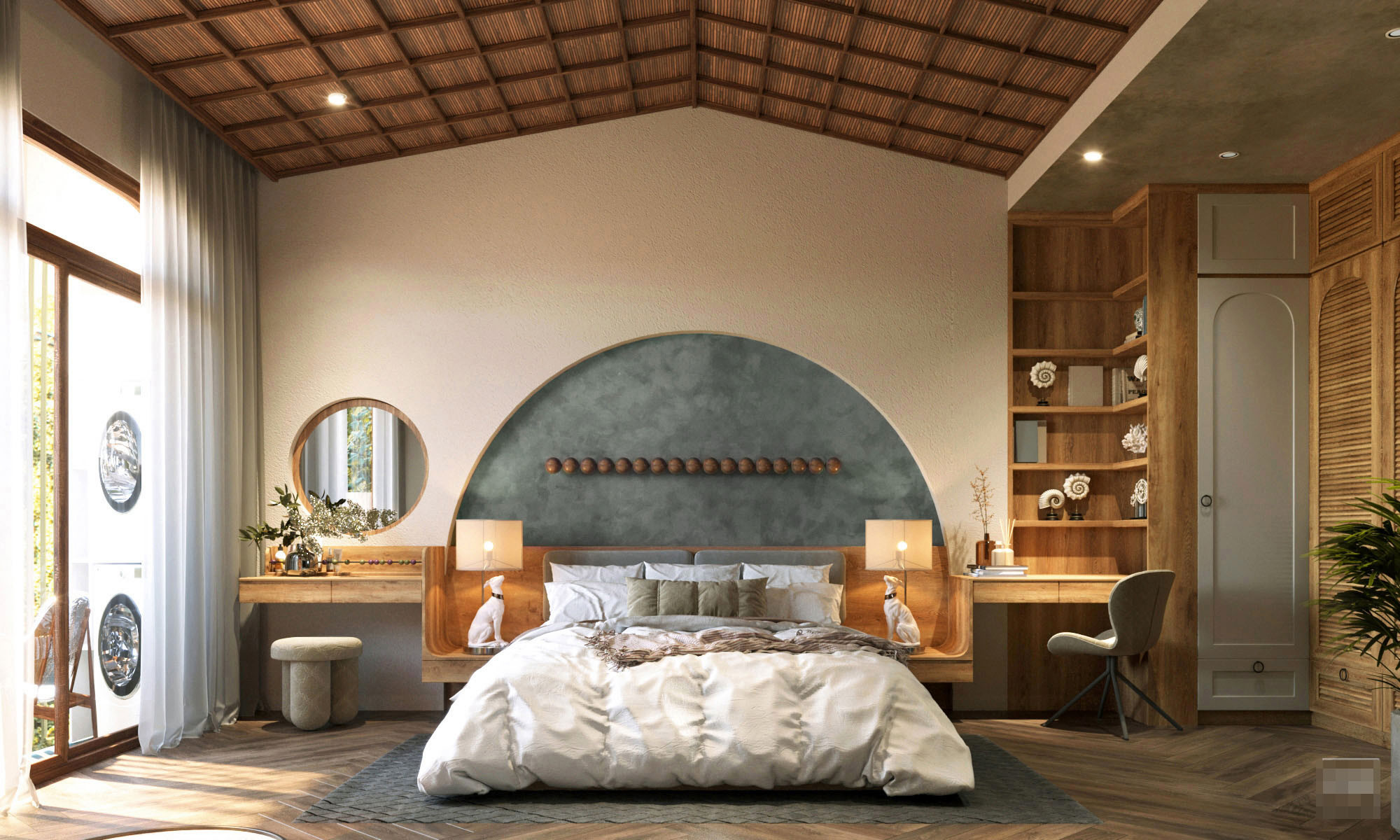 Phòng ngủ master với khung cửa vòm dẫn vào vệ sinh.